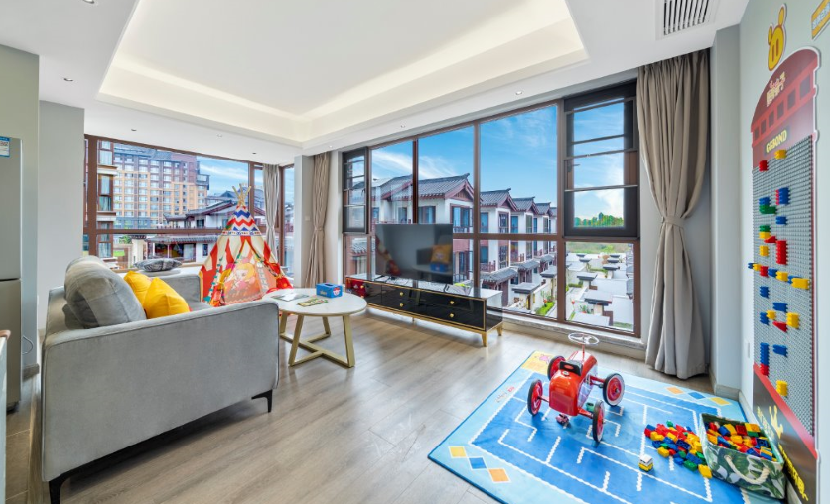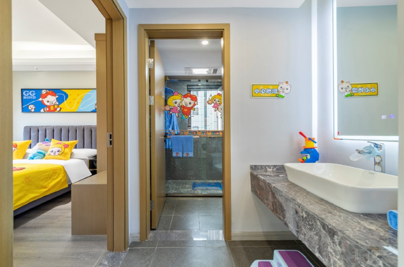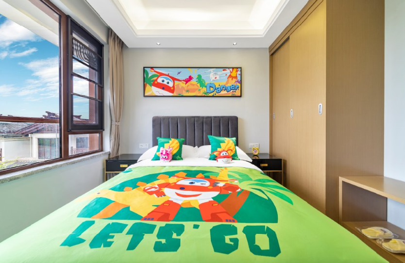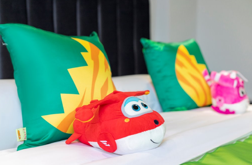 房内还贴心配置了超级飞侠主题帐篷、摇摇马等儿童专属玩具,为孩子打造了一个欢乐的小天地,彻底释放孩子的玩乐天性,萌哒哒的超级飞侠抱枕,陪伴小朋友一夜安眠