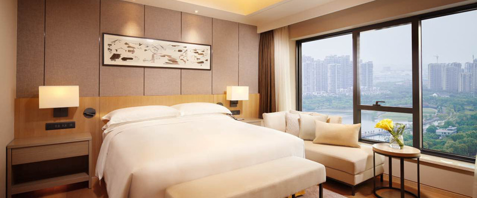 每间客房均可透过落地玻璃窗,尽情饱览城市美景,部分房间还可以看到金鸡湖湖景。若是亲子家庭客人,还可致电前台送儿童洗浴用品一份,含儿童浴袍使用,牙刷、拖鞋。