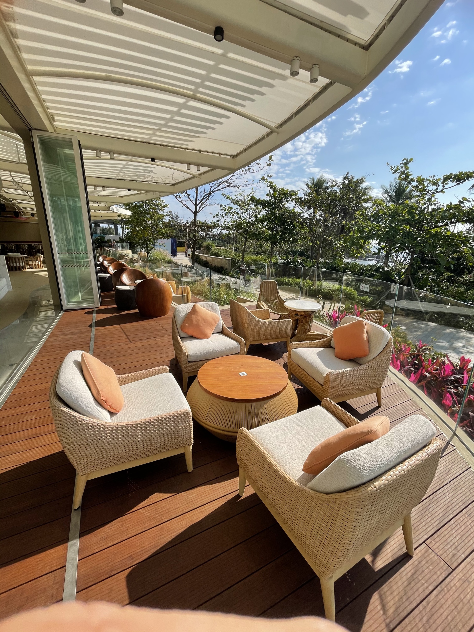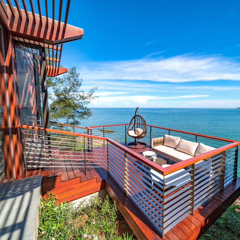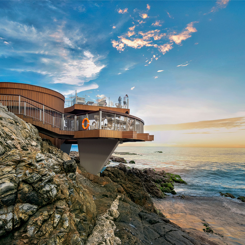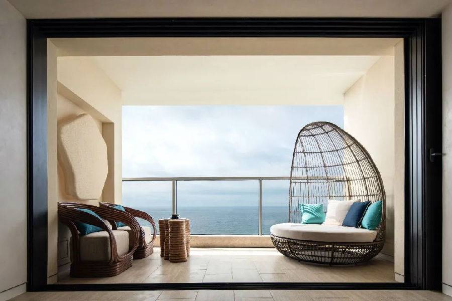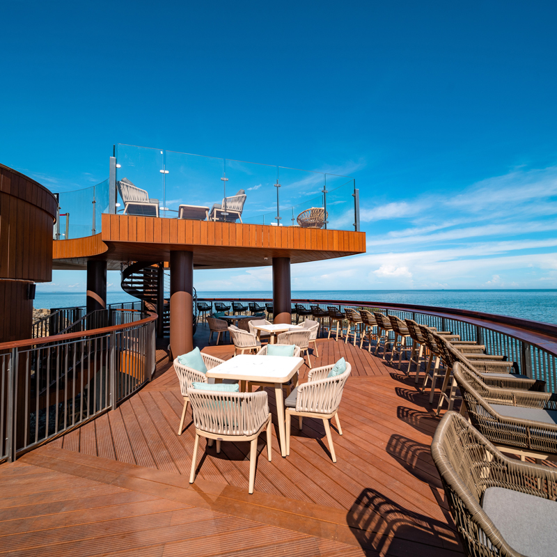 穿过酒店大堂,寻着海浪的声音,拾级而下,到达露台 ,可随处体验到大海的波澜及触动心灵的海浪声。开阔的视野,无限向海延伸 ,形成了这独特的亲海露台,让人栖身户外 ,感受大自然带来的愉悦感。