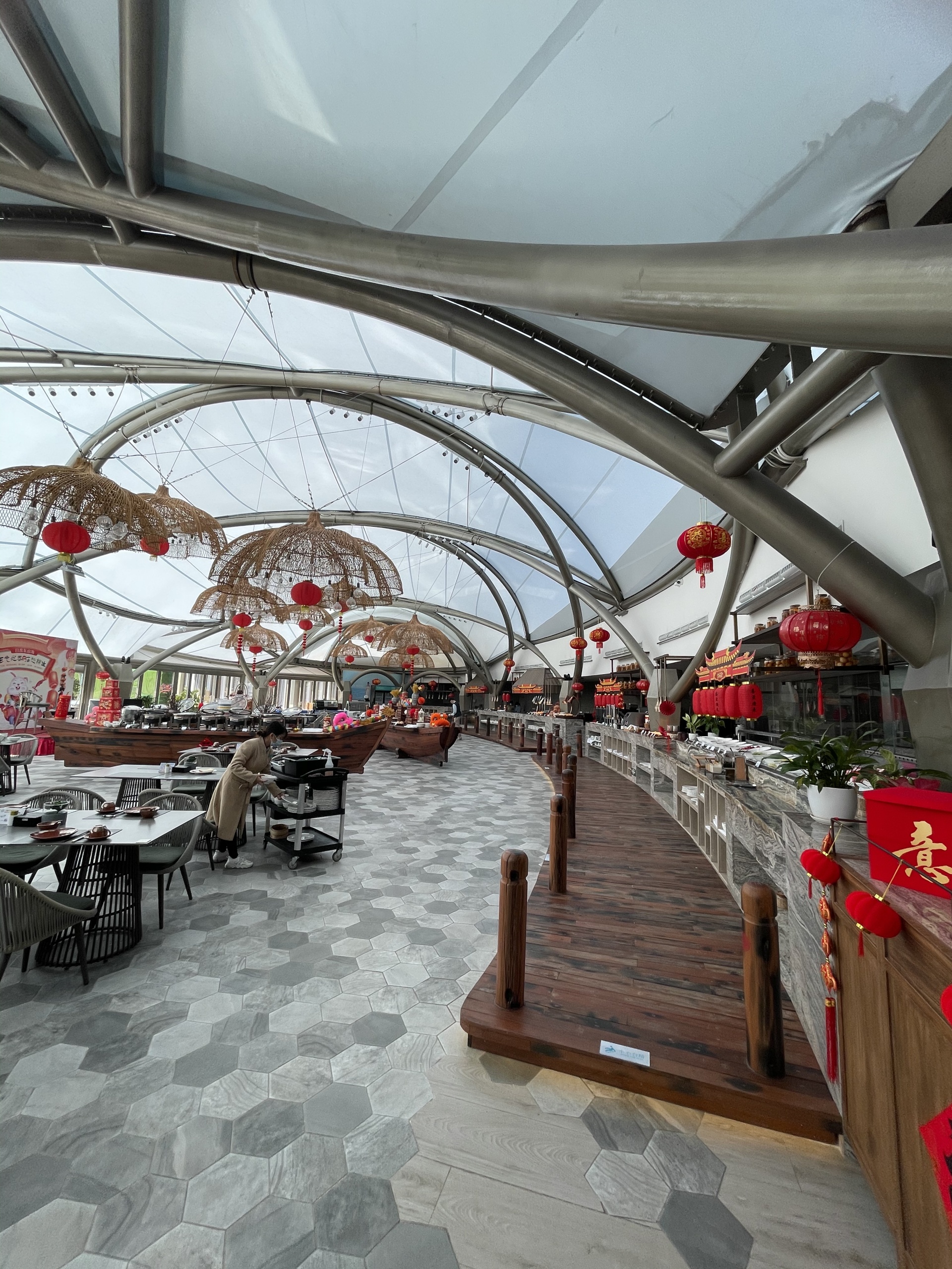 港口海鲜,当地特色文化的全日制主题海鲜餐厅,双月湾海洋美食文化坐标。也是国际米其林星厨和国内海洋美厨的竞技场和美食IP的发祥地 。室内450位 ,户外250位 ,可供700人同时用餐,星厨工作室的包房最适合10-20位嘉宾汇聚一堂。由榕树广场、海鲜市场、渔人码头二部分组成,每季更新菜单,采用每日打捞上岸的本地海鲜,每天市场采购的新鲜食材,用最纯粹的本港烹饪风味 ,为酒店住客、会员和游客提供早、午、晚、下午茶及宵夜的24小时美食时光。