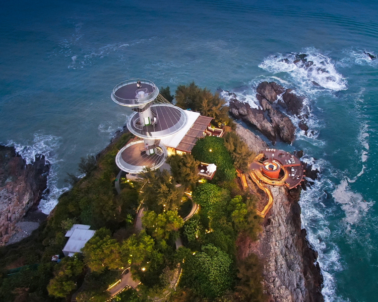 因其地处北纬22° ,主体高度22米,是“世界滨海度假天堂"的坐标性建筑之一。顺着这个纬度向东看去,似乎能够看到身处同一纬度的夏威夷、 加勒比海、迈阿密、维多利亚港的景象,环球同此欢腾……牛头岭观光塔, 直面太平洋的正东方,是日出的观景点之一,日出东山海也因此而名。“东山海日出”与黑排礁石、蓝眼泪、三月同辉、海市蜃楼,构成了双月湾五大自然奇观。塔远眺,一轮红日跳脱天际线,佛光普照、彩霞满天、身后是万物升腾,脚下是万顷波涛……