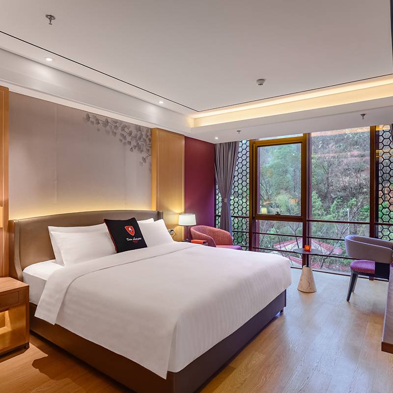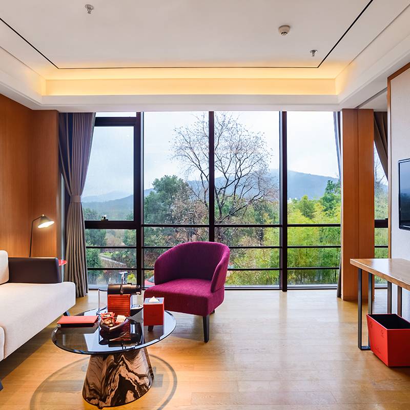 40间客房和套房设计风格现代雅致,房内独有的红调物品,让人眼前一亮,视野开阔的落地窗,运用苏州园林的“借景”手法,将玉屏山的秀丽景致引入房内。每一间客房均配备戴森吹风机和胶囊咖啡机,真正的舒适感体验感双达标,入住其中,既能欣赏到山野间的自然风光,又能感受到意大利品牌对于匠心服务的坚持与执着。