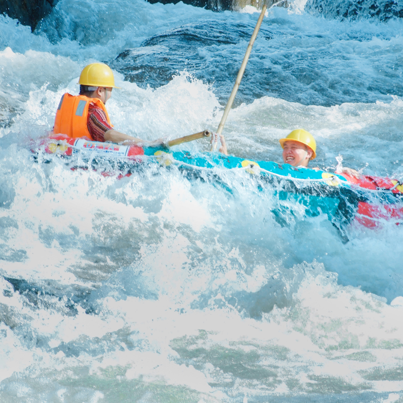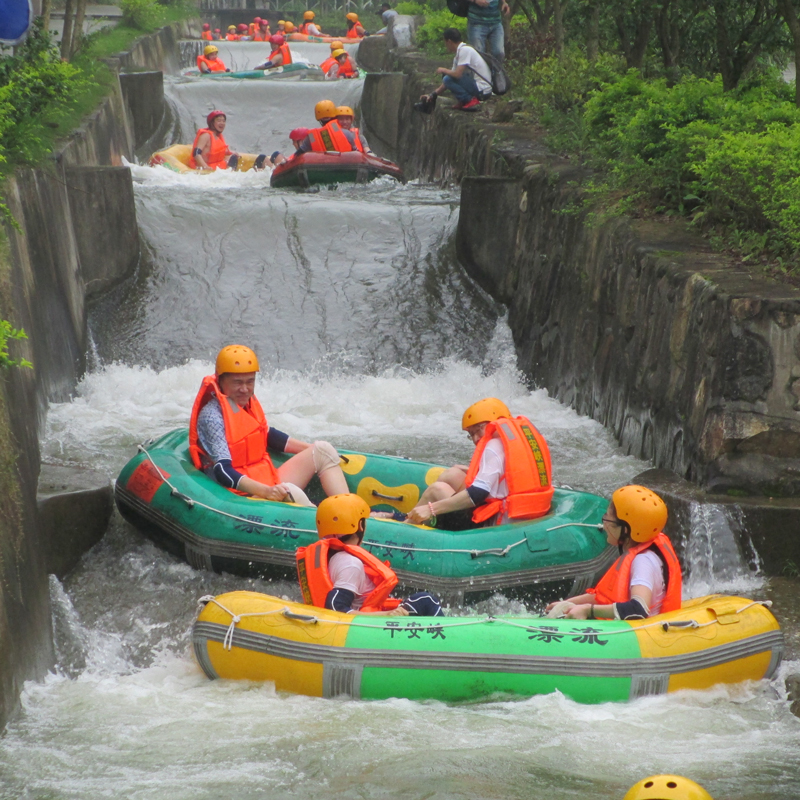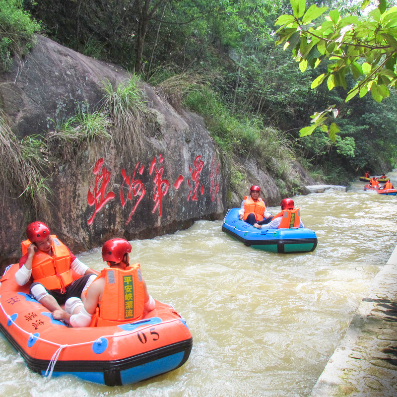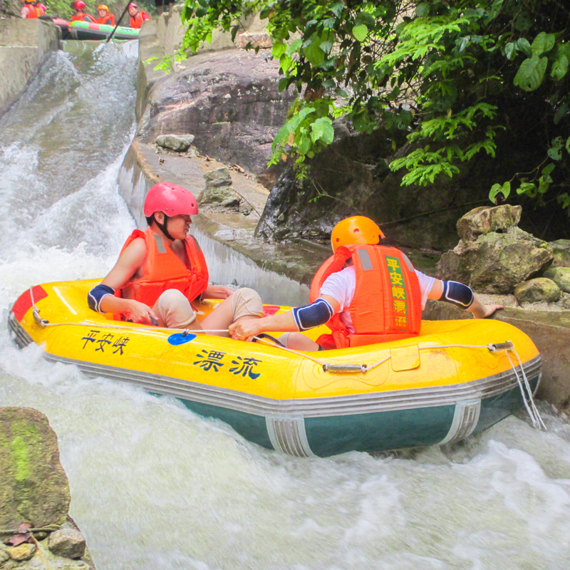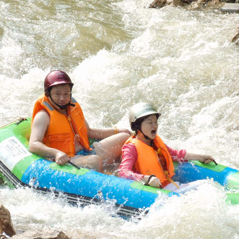 漂流橡皮艇是两个人一条,一定要选择与自己体重相对匀称的坐一条船,坐船两头的位置两者也要互相对称平衡,这样才能更好的保持船身的平衡和自身安全。如个人体重含150斤以上的游客可以独自乘坐一条船,坐在船中间,抓紧扶手;