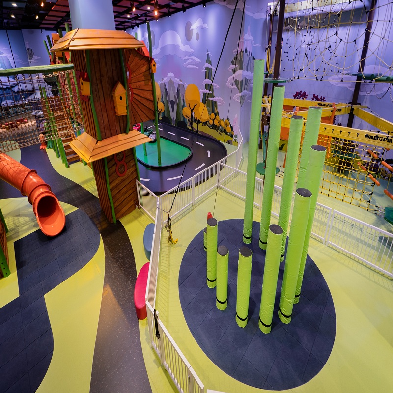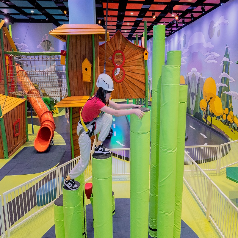 大家先在「猴子绳堡」考验身手、攻克障碍堡垒再跨越12条不同高度的柱子,完成「竹林登梯」选择一条适合自己的线路「赤手登峰』。在确保环境足够安全的前提下,小朋友也可获得冒险的快乐!