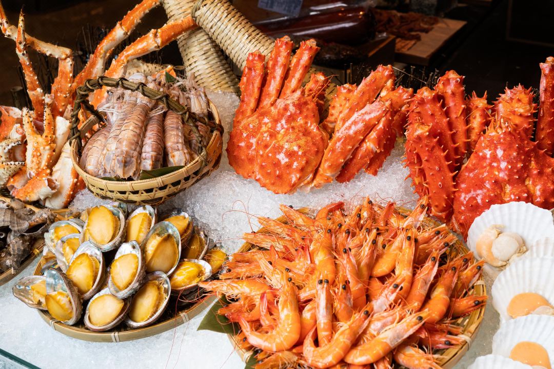 龙虾、鲍鱼、大虾、扇贝……所有海鲜都是经过精挑细选的,个头大、肉质饱满、 品相优良,整整齐齐陈列在料理台上,等待着你的到来。(每位成人享有半只蒸龙虾)