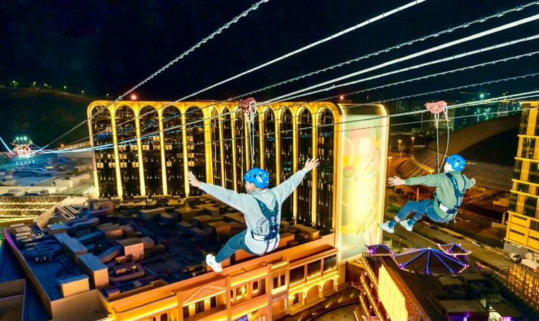 夜間飛行可以享受世界級的沉浸式超感官視聽娛樂,並同時經歷刺激震撼的飛索旅程。兩種飛索旅程體驗都同樣刺激震撼。澳門飛索是最獨特的旅遊勝地及適合家庭遊樂的熱點,賓客能感受未來,踏上夢幻般的高空滑飛索之旅,享受地心吸力帶來的 「飛」一般冒險旅程。
