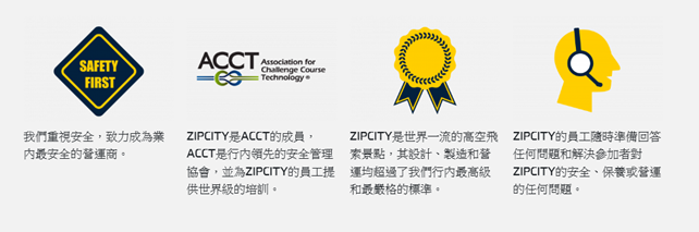 「澳門飛索」超越世界級的高空飛索景點,其設計、開發、構造和營運均超越了行業內最高和最嚴格的標準,以及實踐。澳門飛索致力於遵守最高的安全和操作標準,成為業內最安全的營運商,更是行內權威「挑戰課程技術協會 (ACCT) 」的成員。該協會負責管理安全性並為全球飛索行業提供專業培訓。