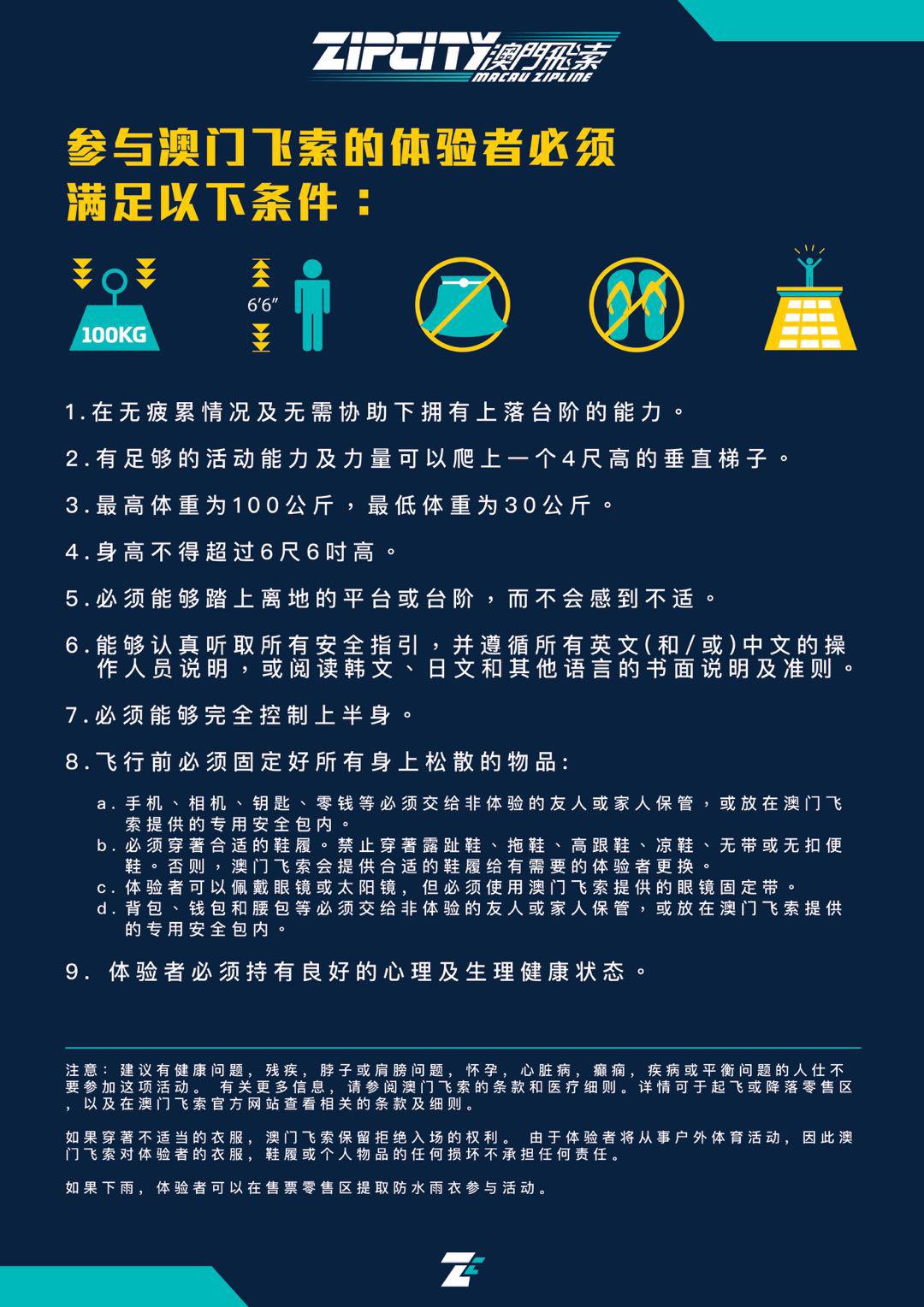 而於進入安全閘之前,必須把物品放入澳門飛索的專用包內,以及要清空口袋,避免物件在飛行過程中墜落。飛行開始前,工作人員會為你扣上安全錨,滑索輪和后援裝置。飛行開始時安全錨會被釋放。你會在高空滑過388米長的滑索, 到達登陸塔之前,制動系統會接合而發出聲響。 這是完全正常的。請保持鎮定,澳門飛索的工作人員會幫助你登陸。到達登陸平台後將會被扣在安全錨上,然後脫離滑索輪。