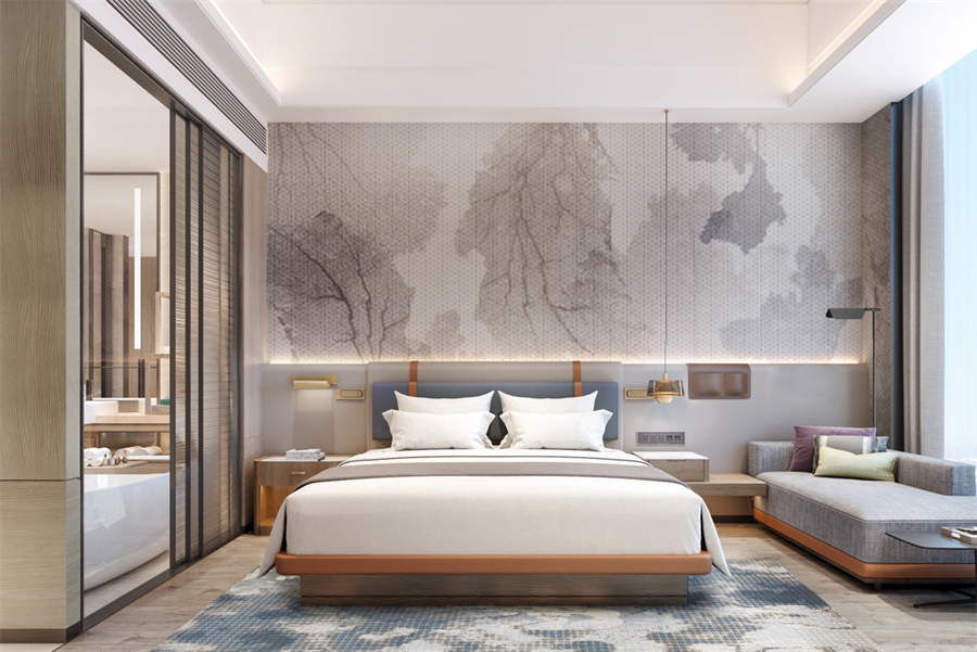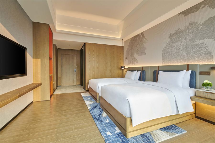 在明快的色块关系中设计师特意使用了岭南建筑特色、岭南陶瓷作为艺术装点;在客房背景使用了挂绿树影的艺术形象作为当地文化的象征,同时也让客人感受到树下提着蒲扇乘凉的岭南休闲感受。