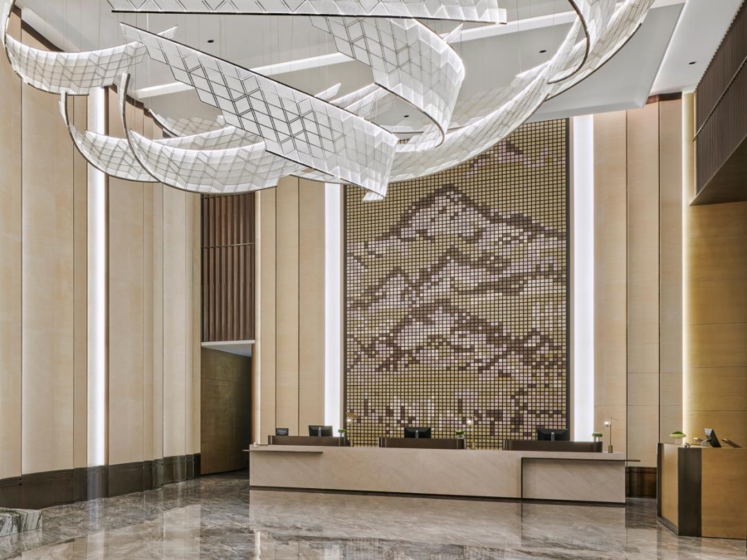 用凤凰羽毛形态的吊灯,挂绿湖面碧波映射出增城延绵起伏山峦的画面,使用现代美学的手法打造出的前台背景,用写意的手法去表现增城九重之高仙城,让整个大堂空间突显尊贵感。也给客人一种从进大堂开始就迎面而来的传说及传统的文化传承。