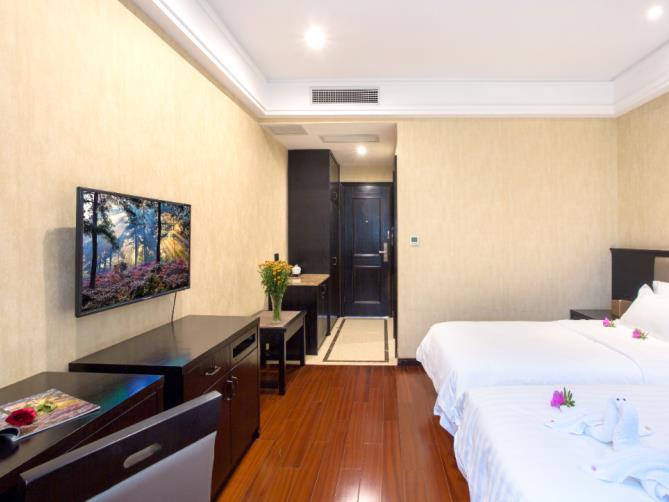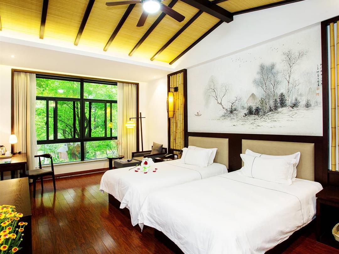 酒店共有185间客房,步入客房,古朴雅致的气息扑面而来。暖色调的家具与灯光,营造温馨浪漫之感。每间客房搭配壁挂的画作与具有安吉特色的竹雕装饰都在告诉你,你正处于一场有情调的旅行中。