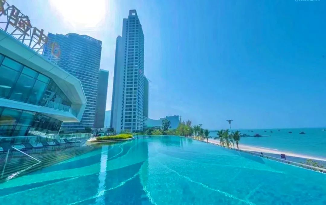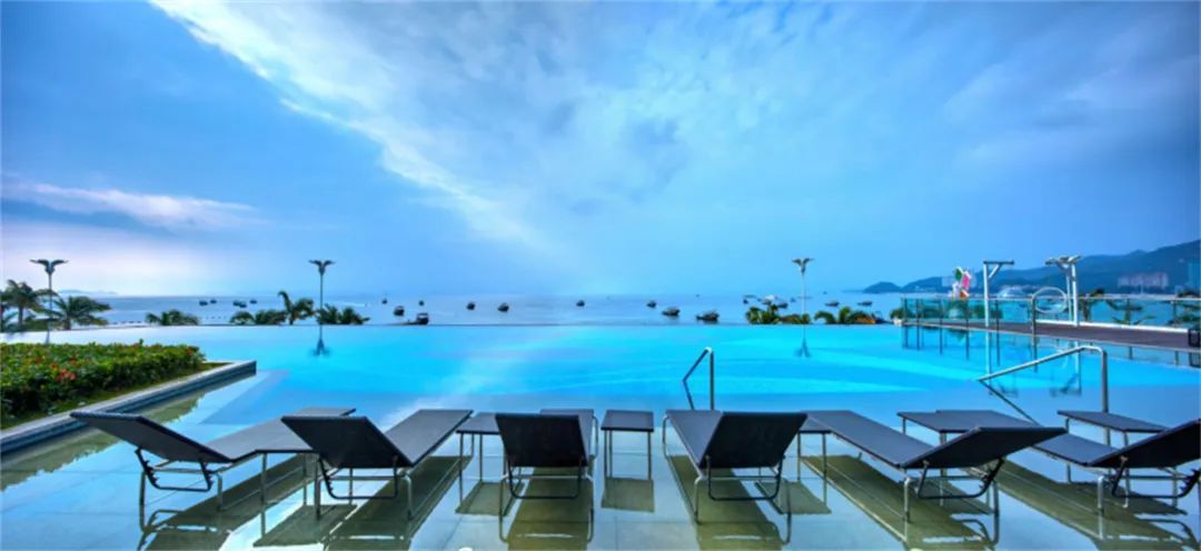 泳池和前面的大海,以及头顶上的蓝天,似乎连在了一起,呈现海天一色的美景。