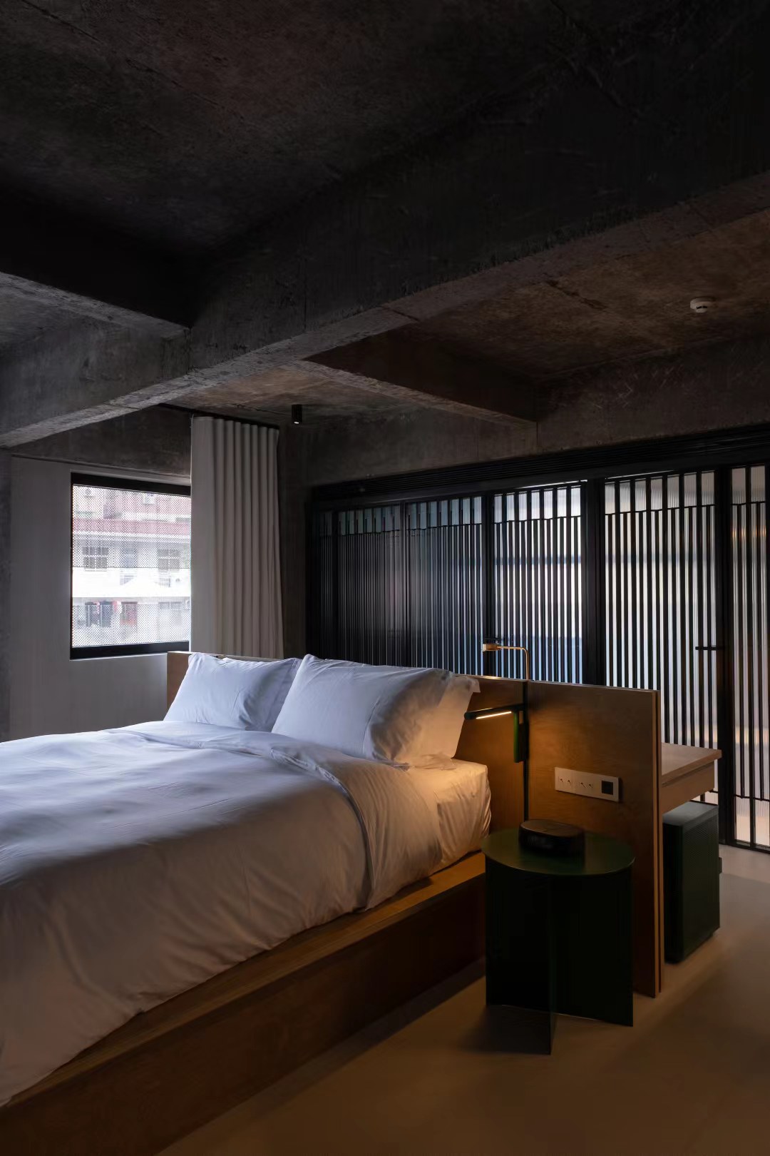 在南头古城有熊酒店,每间客房保留原始的了结构与梁架,以南方街巷常见的折叠“铁帘幕”为灵感,作为客房隔断的设计语言,如恩特别定制的家具各安其位,在层层帘幕之中,像是不同身份与面貌的人,等待着与旅人的相遇。