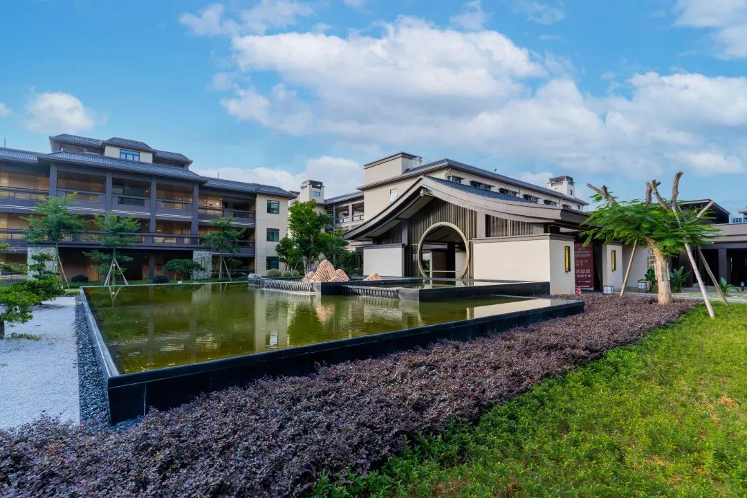 酒店拥有类型多样的客房,分布于八栋小楼,通过连廊衔接围合成庭院,彰显了酒店鲜明的新中式风格。清新雅