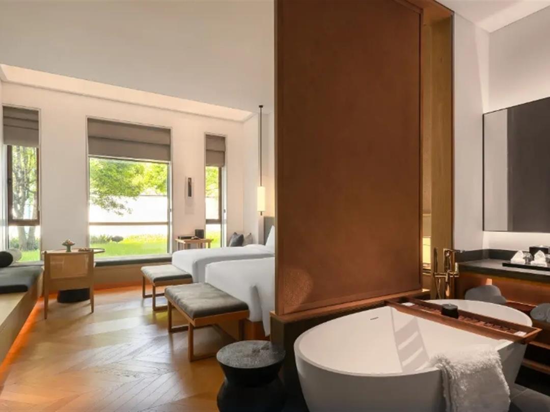 酒店占地50亩,建筑面积2万平,就一间度假酒店而言,算是相当阔绰的用地,但璞祺艺境所有的房间加起来也不足百间。客房面积50㎡-350㎡不等,给足了客人们在客舍内的居停范围。