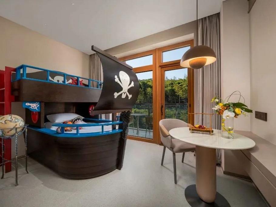 家庭房整体布置充满浪漫可爱的气氛,空间设计合理,宽敞明亮。海盗船式的上下铺,粉、蓝单人床,不同风格的儿童帐篷、儿童浴袍、儿童洗漱用品等都有。部分房间配备阳台,及简约的玻璃茶几和座椅,泡上一杯茶,等夕阳,浪漫温馨。