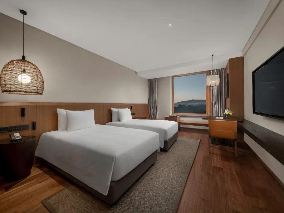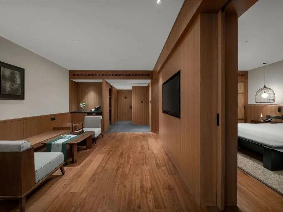 酒店一期共有112间客房,有别墅,也有主题客房。设计上流淌着开元度假村一脉相承的沉稳、简约,但又着原木的包容,外加大面积向着山野的窗景。