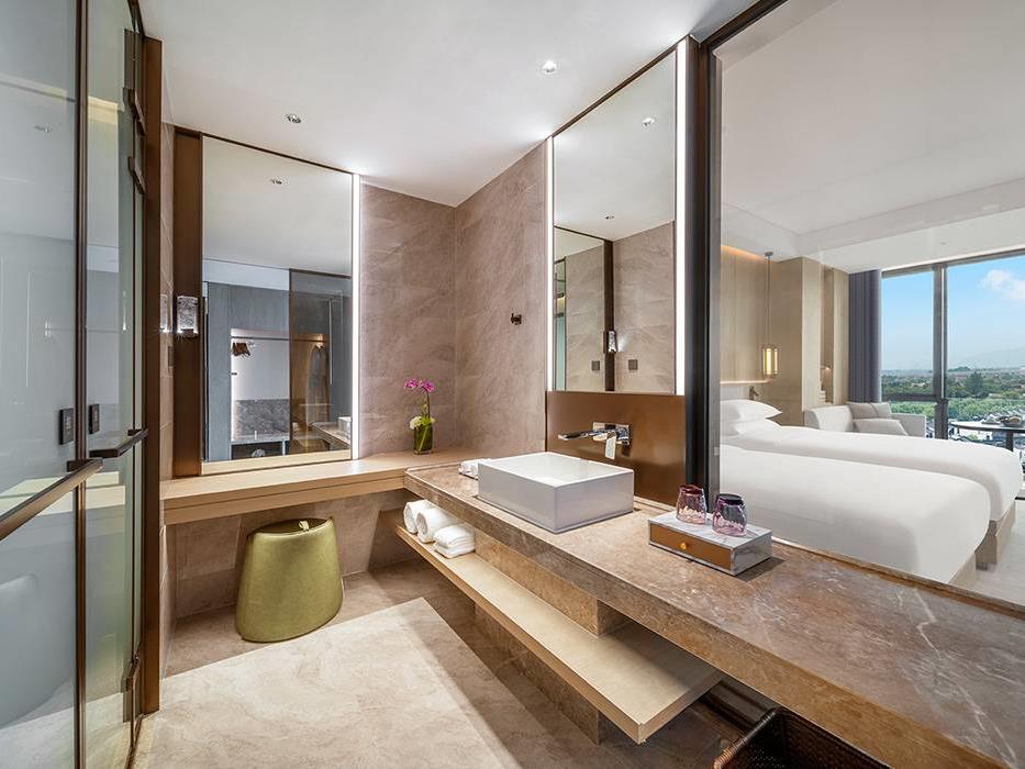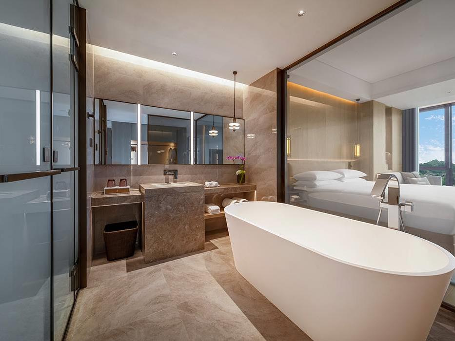 位于酒店主楼6-8层,以远眺塔山或湘湖,内观国潮庭院及中式合院外景为主,配置了空气净化器、智能窗帘、智能马桶等,超40平的新中式奢派,给了旅行别样的新意。