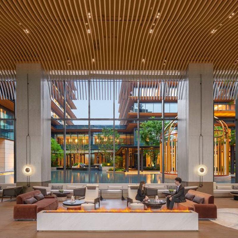 位于酒店主楼3-5层,以低密度内庭及中式合院外景为主,配置了空气净化器、智能窗帘、智能马桶等,无烟楼层,具备舒适旅居空间。