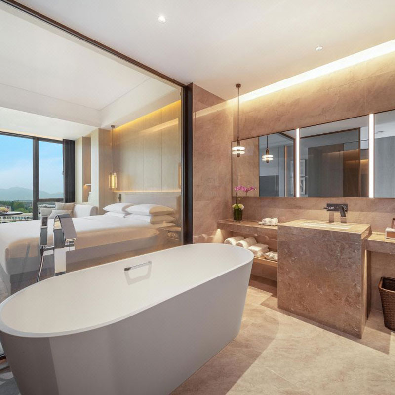 主要位于酒店主楼3-8层,前卫的设计中包含了独立阳台或露台,客房增设了空气净化器、智能窗帘、智能马桶、智能音响等,多重空间缔造一线湘湖景观与自然呼吸体验方式。