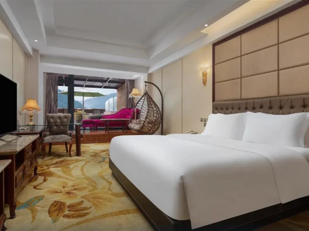 酒店以温泉为核心亮点,温泉区包含硫磺原汤池、山泉池、山地温泉池、森林温泉池等20余种,另有露天大三叠温泉游泳池、小三叠烫泉、冲浪区、儿童戏水池等,水温层次丰富。娱乐设施方面,配备健身室、儿童乐园、KTV、棋牌室、桌球室、乒乓球室、烧烤区等,满足不同年龄层需求。餐饮设施涵盖生态园林式花竹餐厅、紫东餐厅等,可容纳300余人同时用餐。会议设施包括大中小会议室,支持商务会议及活动举办。其他配套有免费停车场、代客泊车、茶室、桑拿浴室、日光浴场等,服务全面。