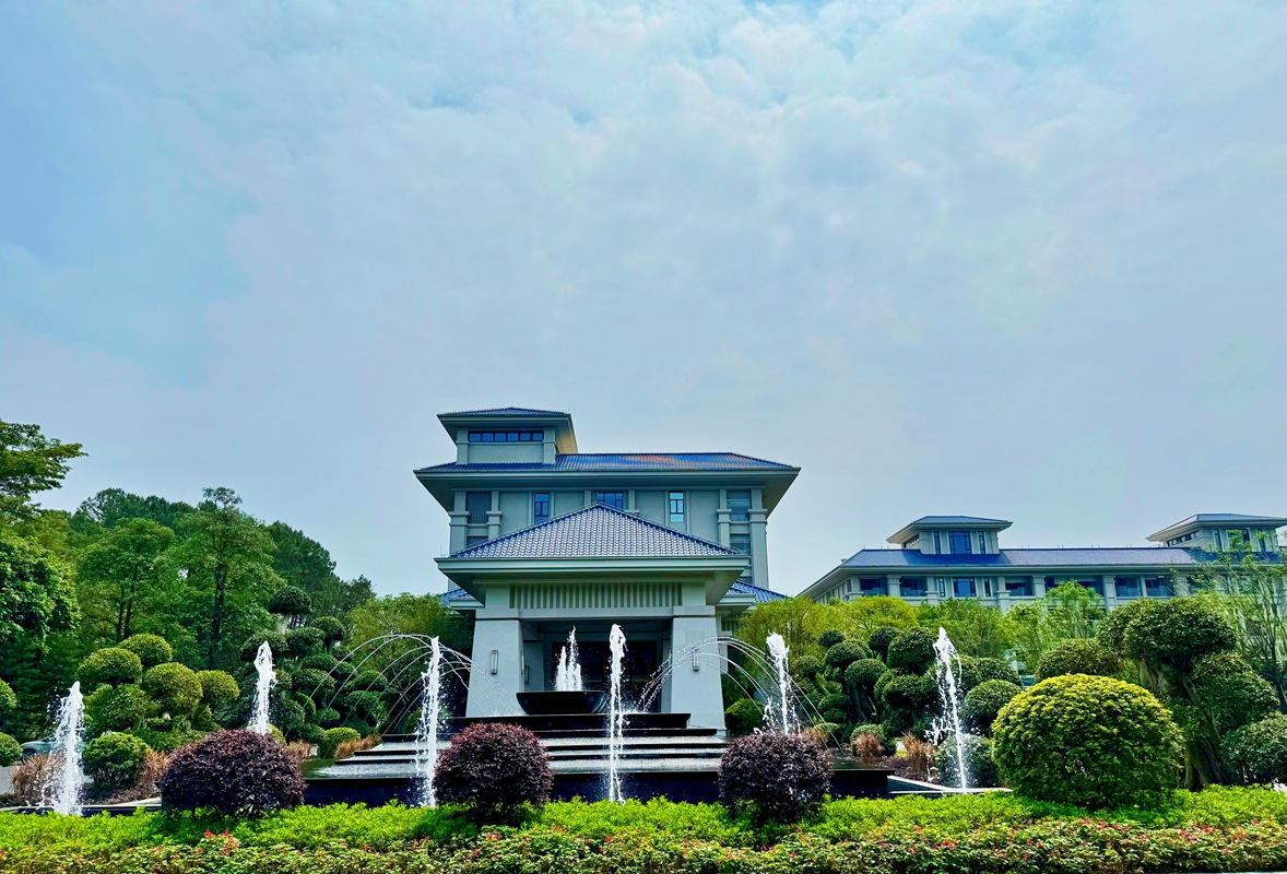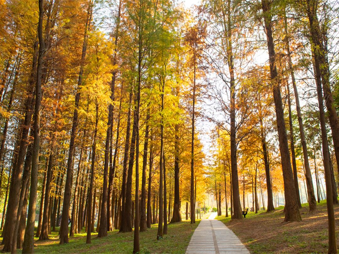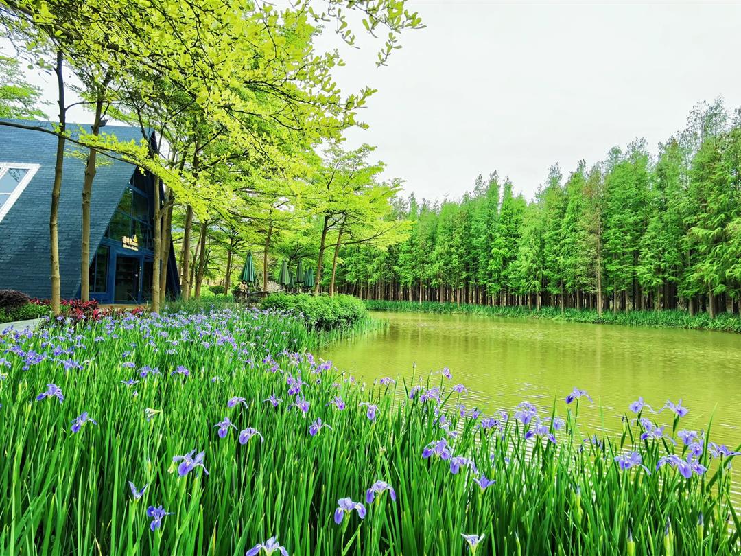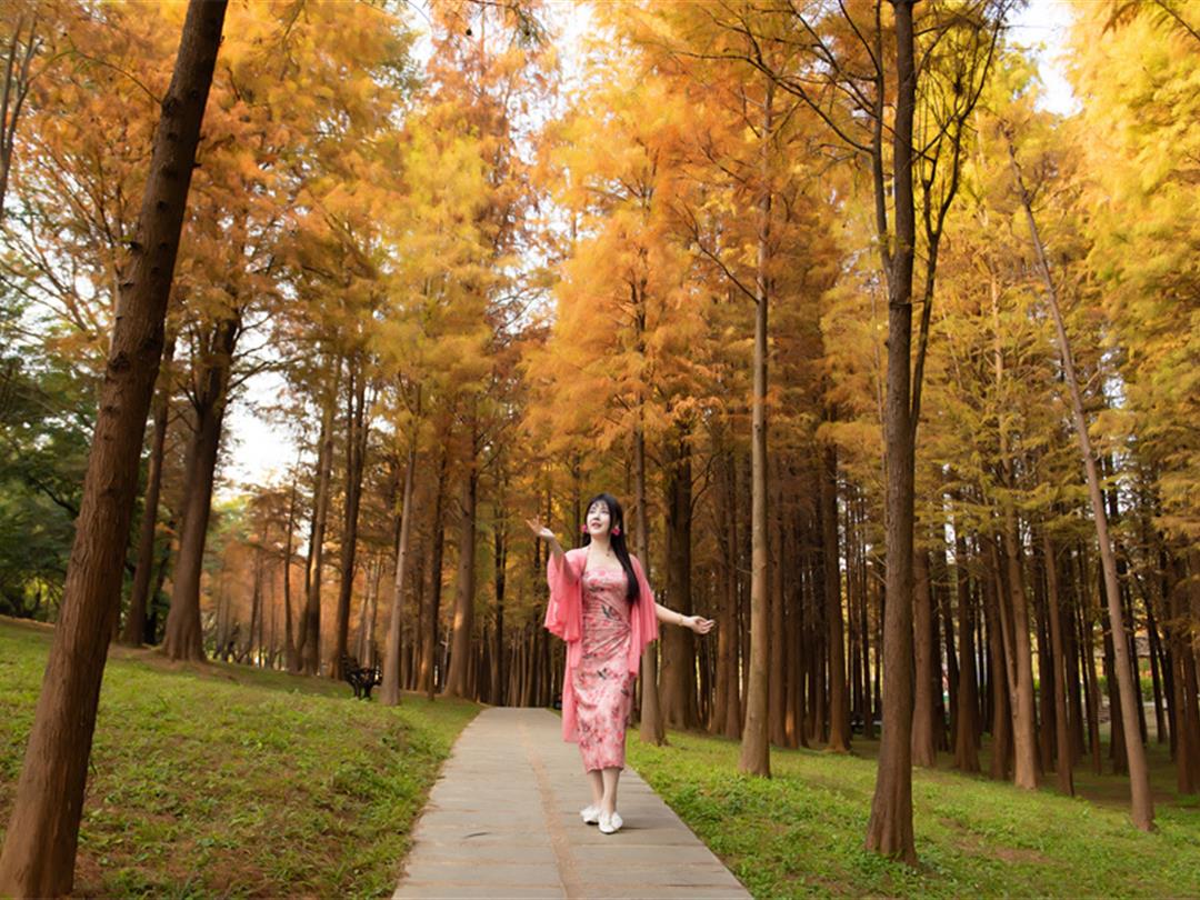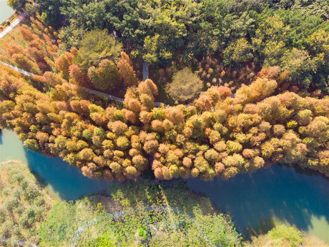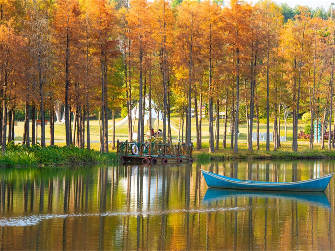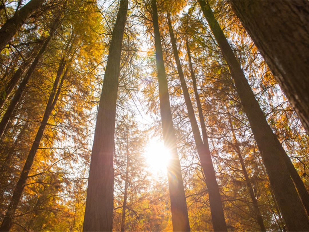 掩映在森林中,矗立在湿地岛水杉林湖畔