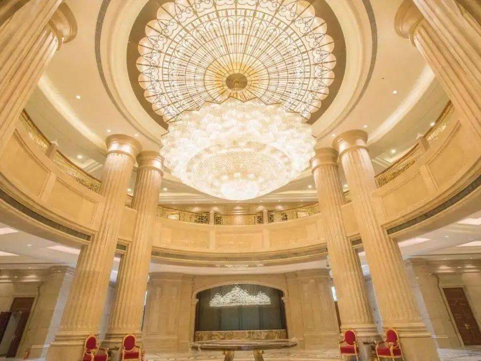 诺大的水晶灯,高大的罗马柱,光亮的大理石地板