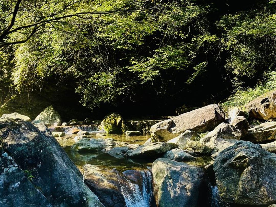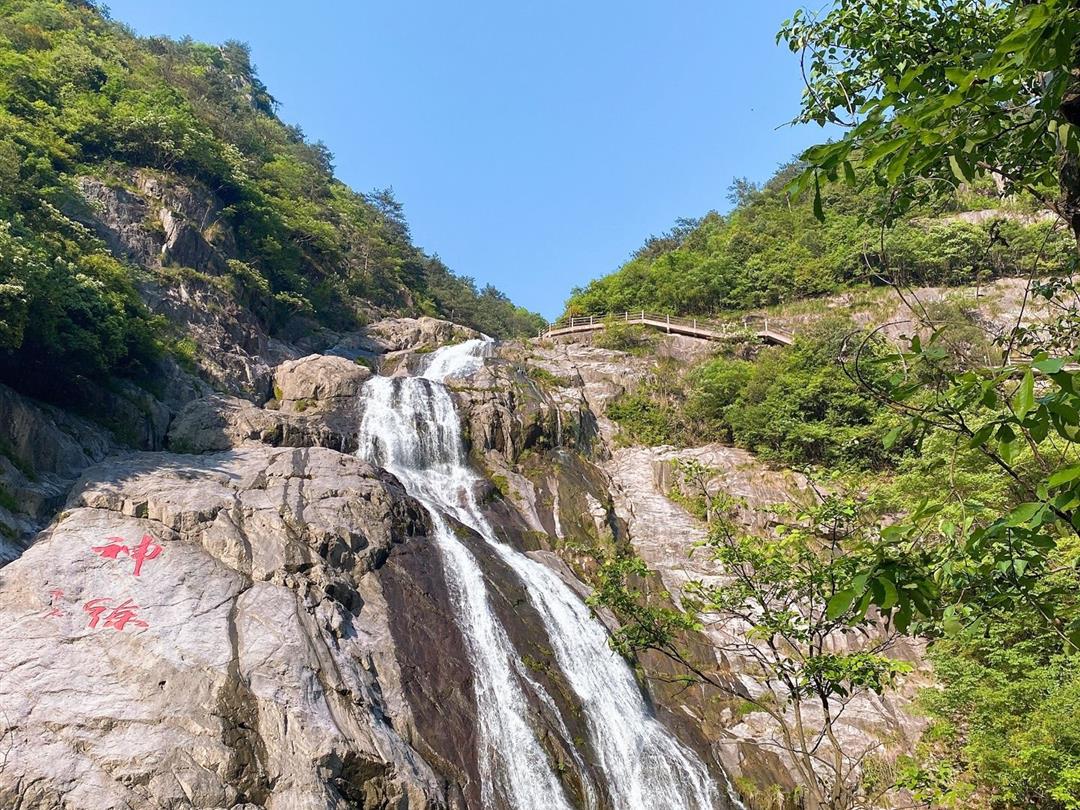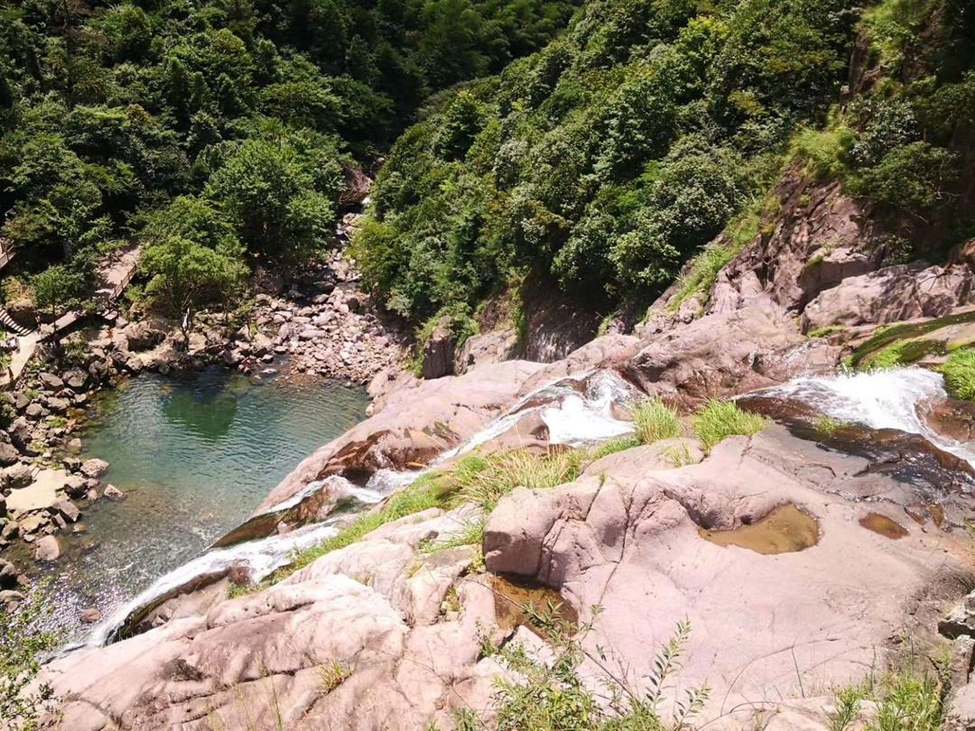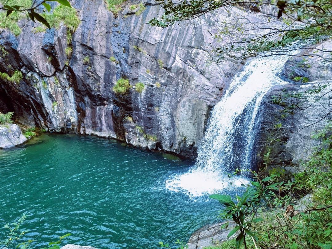 往右侧的珠帘瀑方向走,这边道路平缓,逐步上升,瀑布也一个比一个漂亮,惊喜连连。顺着步道往上走,一路都有溪水和竹林相伴,感觉很不错。过龙潭湖、仙坑飞瀑,到了较高点观瀑亭,经典的百杖潭、卧龙潭、祈雨潭就在这附近了。在此处看,瀑布、深潭景色很壮美。由此顺着金丽古道下山,走到底就是乌坑休憩长廊,稍作休息便可乘电瓶车返回出口了。金丽古道险峻陡峭,周边也没有什么景点,相对来讲由此下山更轻松些。