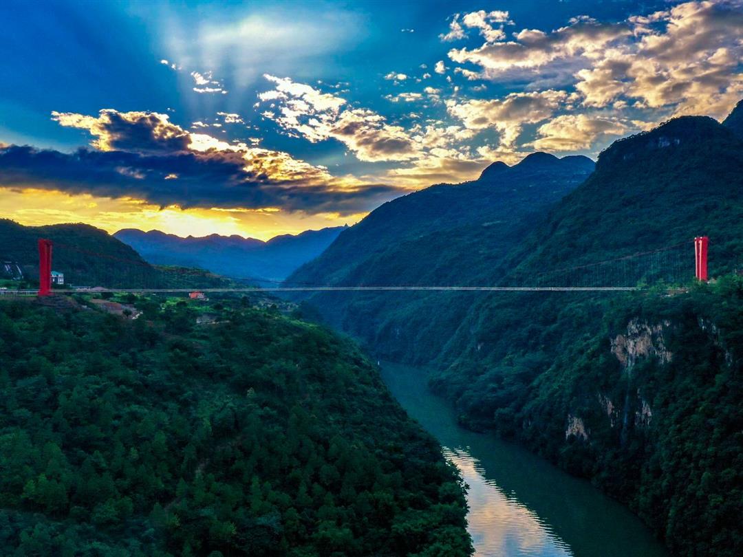这条建造在秦汉古道水路上玻璃桥,横跨湟川三峡陡崖峭壁,尽览粤北大瀑布群,凭借别出心裁的结构和超凡脱俗的外观,已成为连州市高速创造“历史文化之旅、自然景观之旅、国际通道之旅”的标志性建筑。擎天玻璃桥在万丈悬崖与流泉飞瀑间凌空而建,悬浮于湟川三峡的绝壁和深潭之上,与周边环境相互融合,气势磅礴而又和谐统一。远观宛如一条昂首云天、腾云驾雾的巨龙,飞越大峡谷的陡崖峭壁,若隐若现穿行在湟川三峡的烟雨云雾之中。桥身的颜色选用了千年流传的中国红,这不仅是中华民族喜爱的颜色,还是中国人的文化图腾和精神皈依,中国红的色调使整座桥在湟川三峡谷中常见的云雾缭绕里显得更加惊艳醒目。