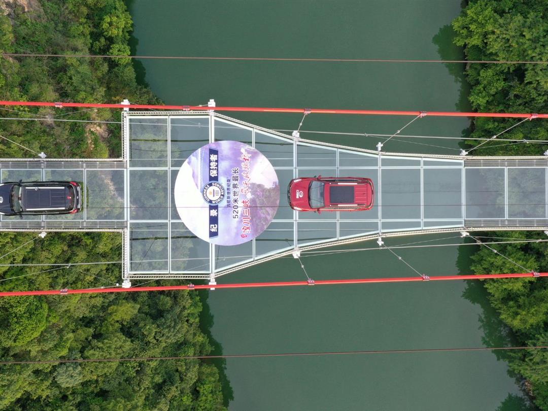 擎天玻璃桥全长为526.14米,是一座大型山谷单跨悬索桥,现场施工采用全预制进口螺栓连接,既保证了项目的安全性,结构的稳定性,又提升了观赏的刺激感。整座玻璃桥通体采用3层4.5厘米厚度的进口超白夹胶玻璃,这种超白玻璃的透光率为99.15%,其水晶般的光泽、高清晰的亮度、超高的光折射率,无不让游客的视野更加明亮、观景更加通透、观感更加刺激。桥梁两侧采用竖向圆弧形不锈钢护栏,让游客在玻璃桥上360°览景拍摄的同时保障安全。