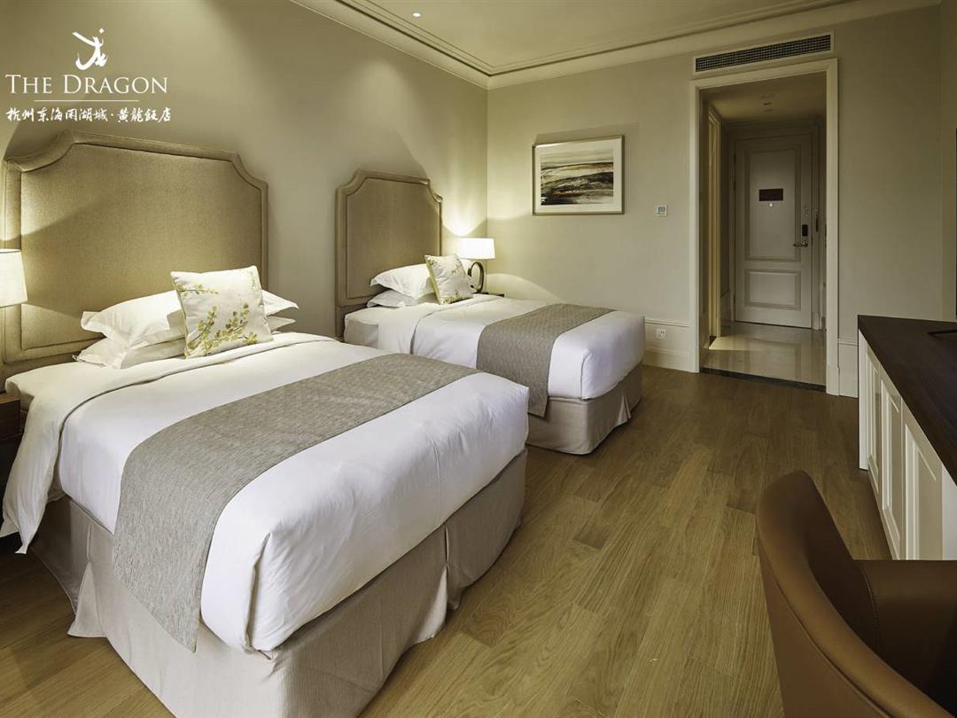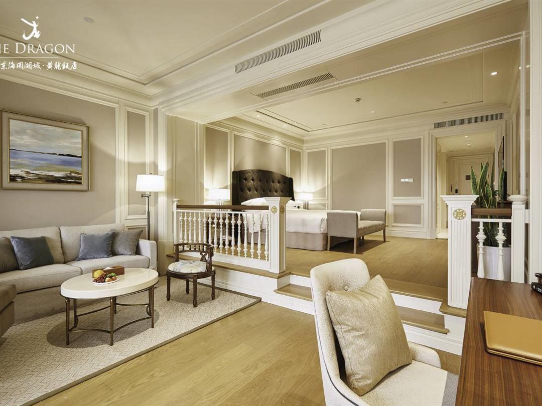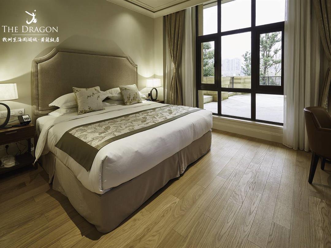 杭州东海闲湖城·黄龙饭店的客房设计渊源来自澳门威尼斯人度假村酒店的客房布局。客厅与阳台间采用180°落地窗隔断,引入无边湖景风光。