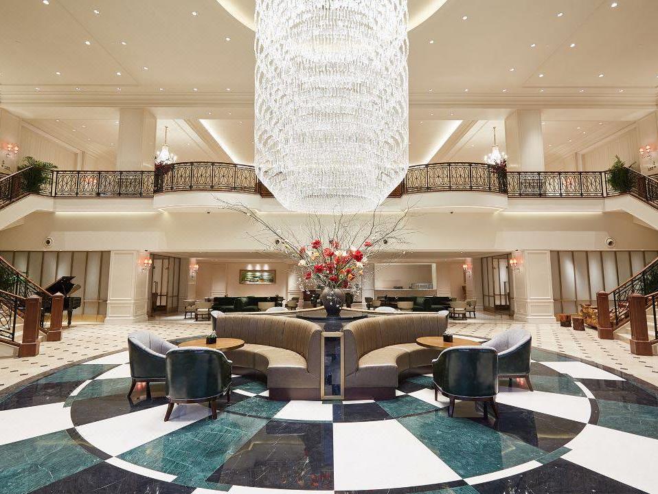 饭店大堂以米白色为主基调,高雅贵气。大堂地毯全部手工制作,璀璨的水晶大吊灯,圆形的旋转楼梯,挑高空间,给人奢华之感。