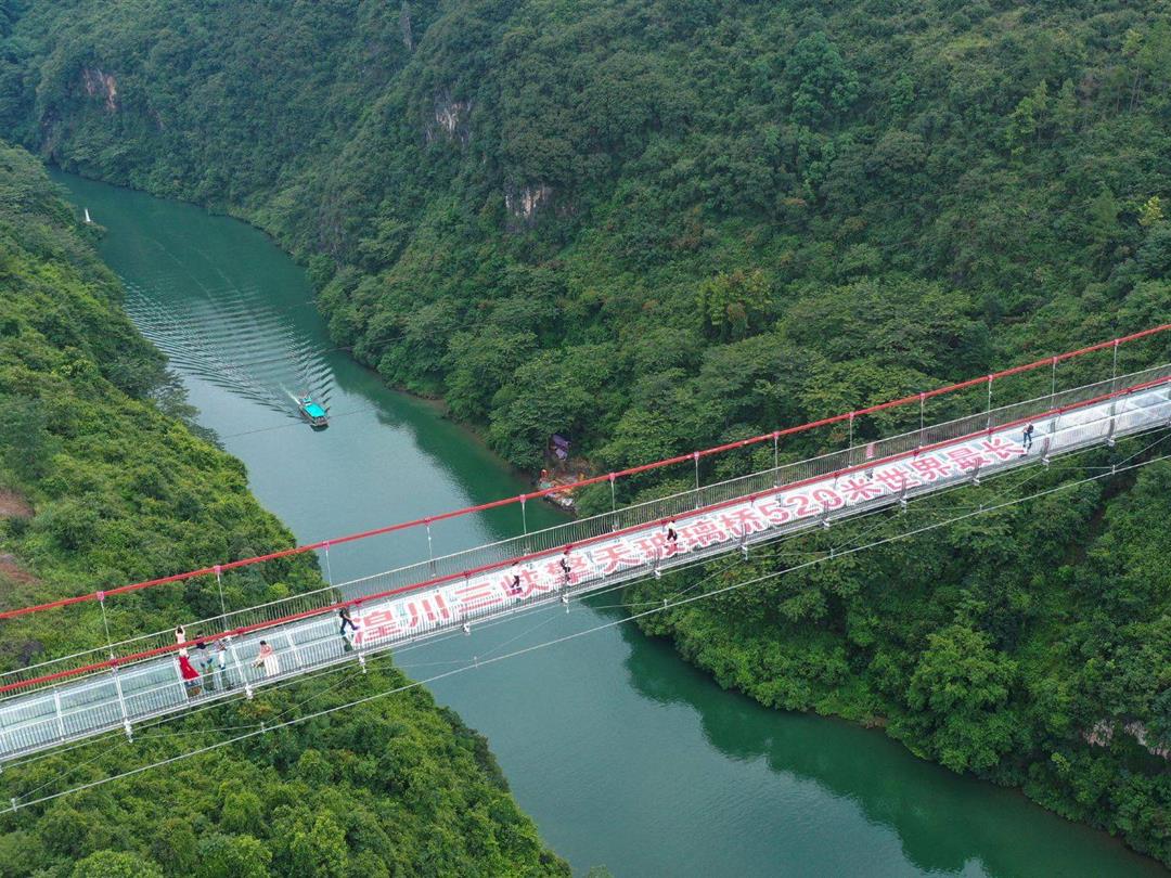擎天玻璃桥,位于广东省连州地区境内的湟川三峡——龙潭度假区(AAAA级旅游景区)内,具有跨度大、桥面宽、重量轻和梁高低等特点,是一座全透明玻璃的景观桥梁,兼具景区行人通行、游览、蹦极、溜索、T台等多项综合功能。