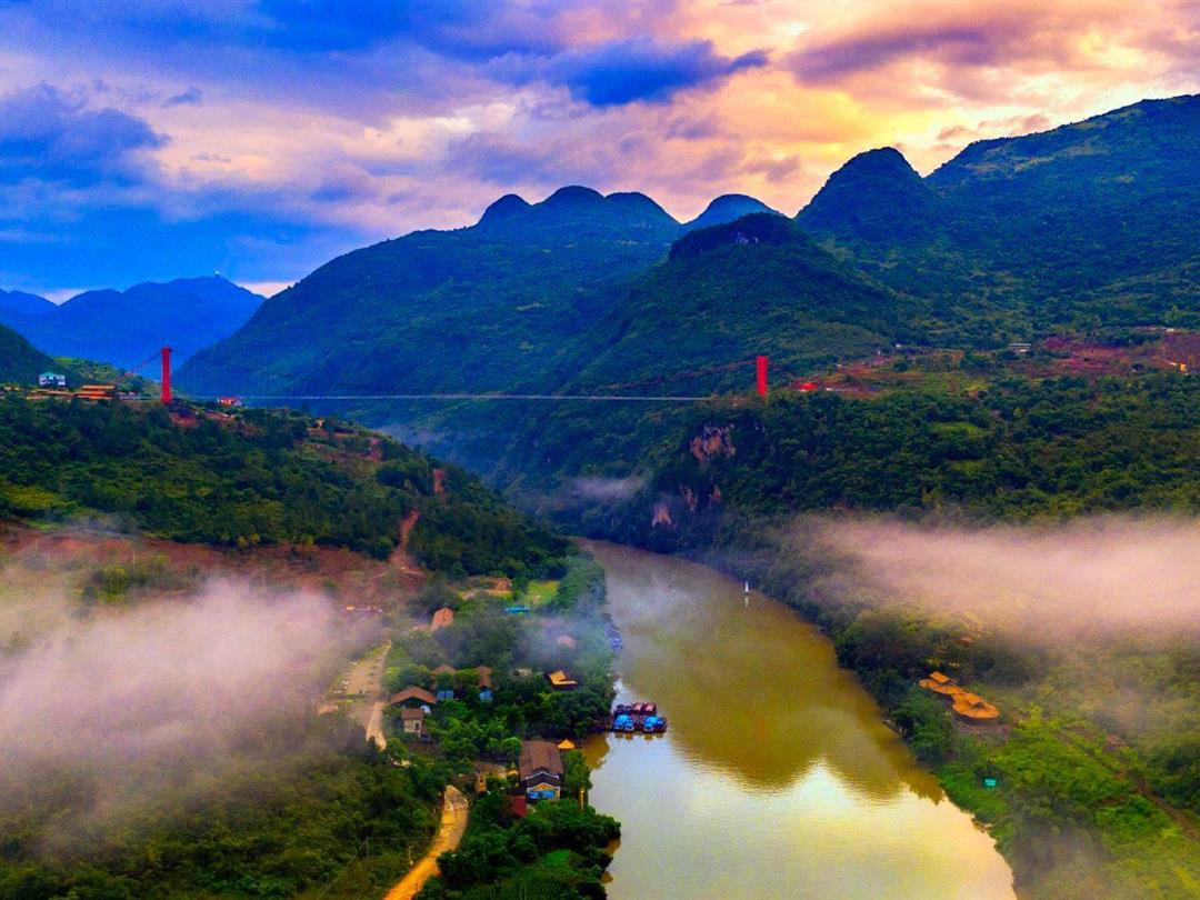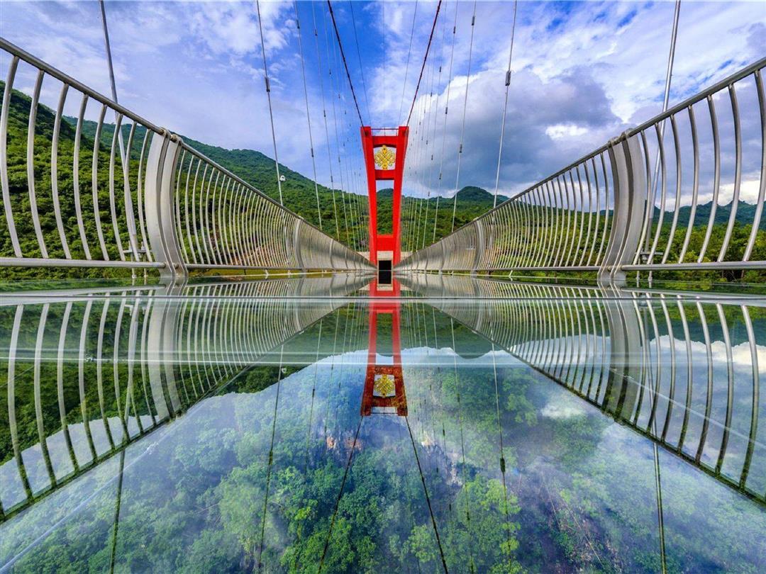 这条建造在秦汉古道水路上玻璃桥,横跨湟川三峡陡崖峭壁,尽览粤北大瀑布群,凭借别出心裁的结构和超凡脱俗的外观,已成为连州市高速创造“历史文化之旅、自然景观之旅、国际通道之旅”的标志性建筑。擎天玻璃桥在万丈悬崖与流泉飞瀑间凌空而建,悬浮于湟川三峡的绝壁和深潭之上,与周边环境相互融合,气势磅礴而又和谐统一。远观宛如一条昂首云天、腾云驾雾的巨龙,飞越大峡谷的陡崖峭壁,若隐若现穿行在湟川三峡的烟雨云雾之中。桥身的颜色选用了千年流传的中国红,这不仅是中华民族喜爱的颜色,还是中国人的文化图腾和精神皈依,中国红的色调使整座桥在湟川三峡谷中常见的云雾缭绕里显得更加惊艳醒目。