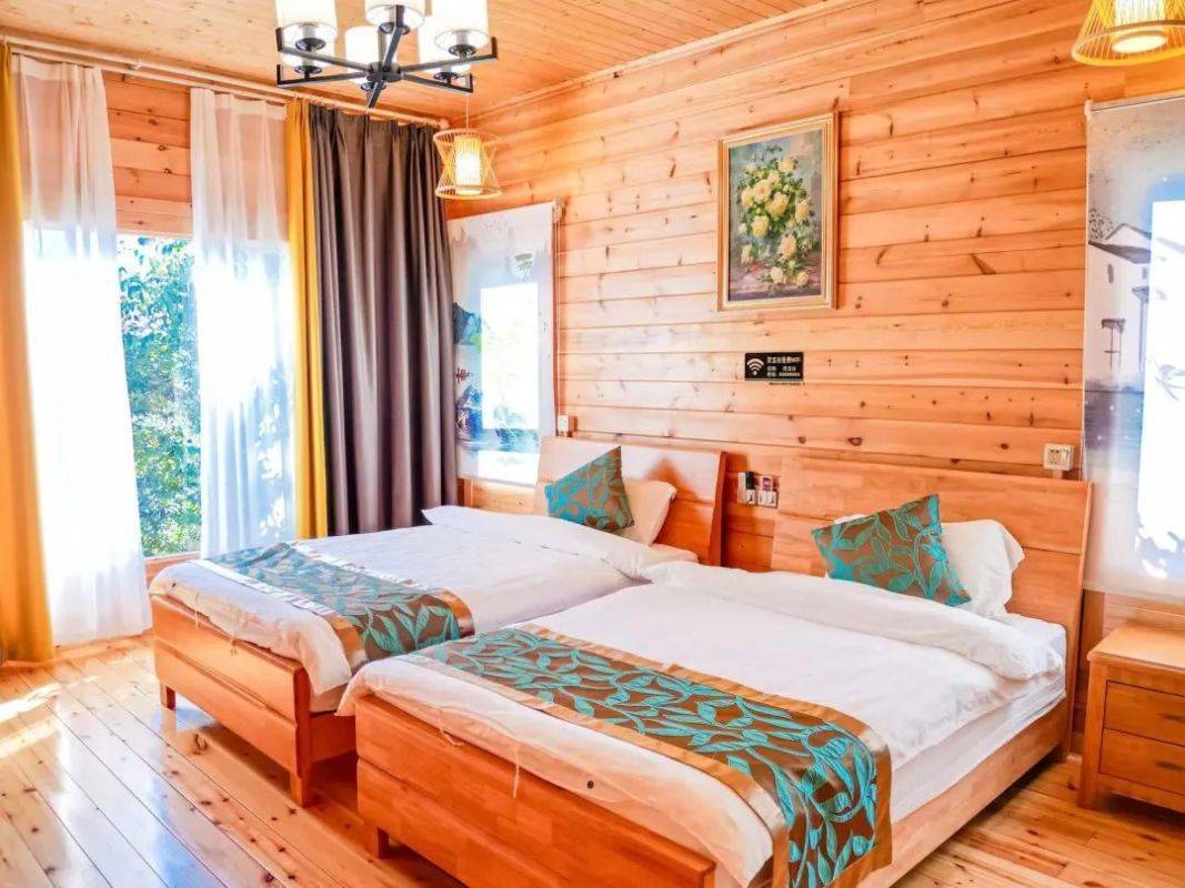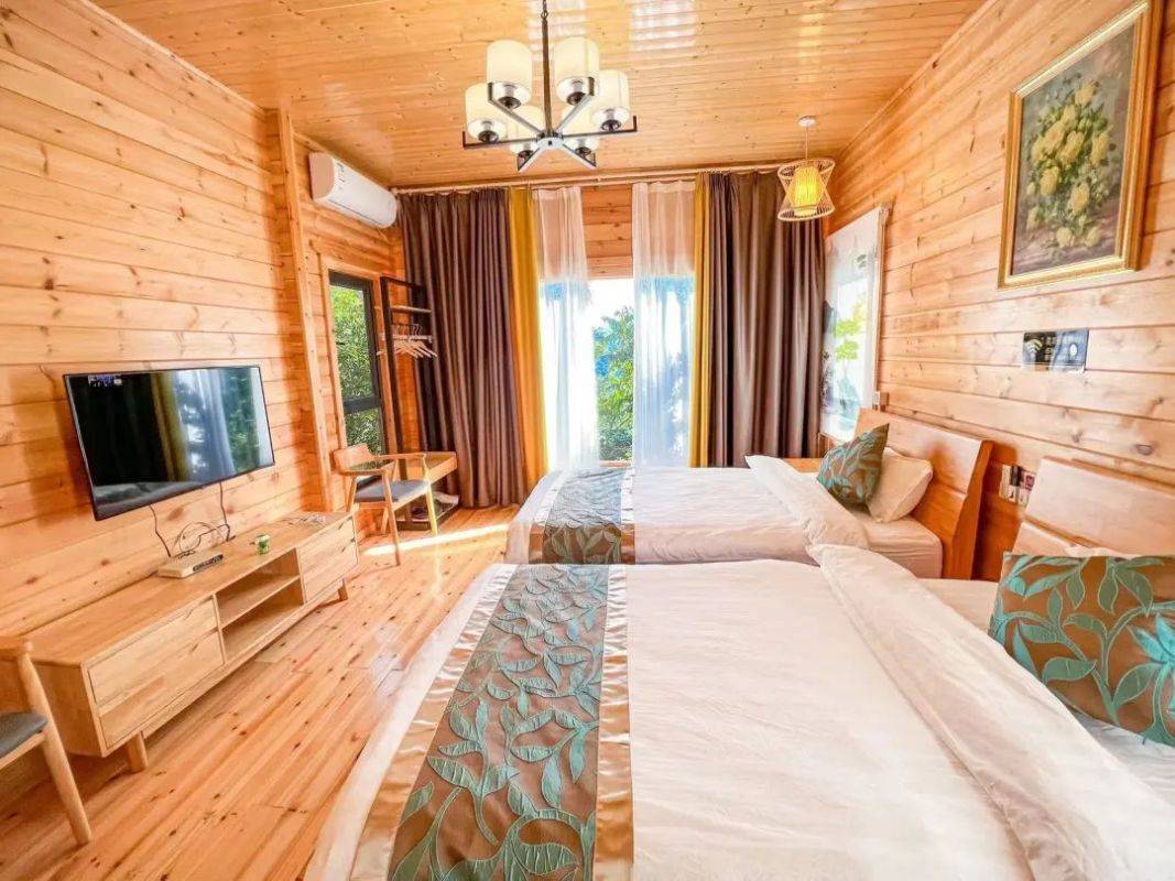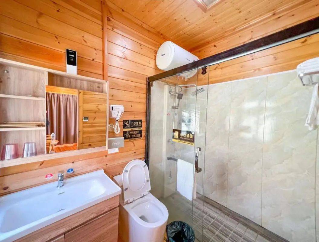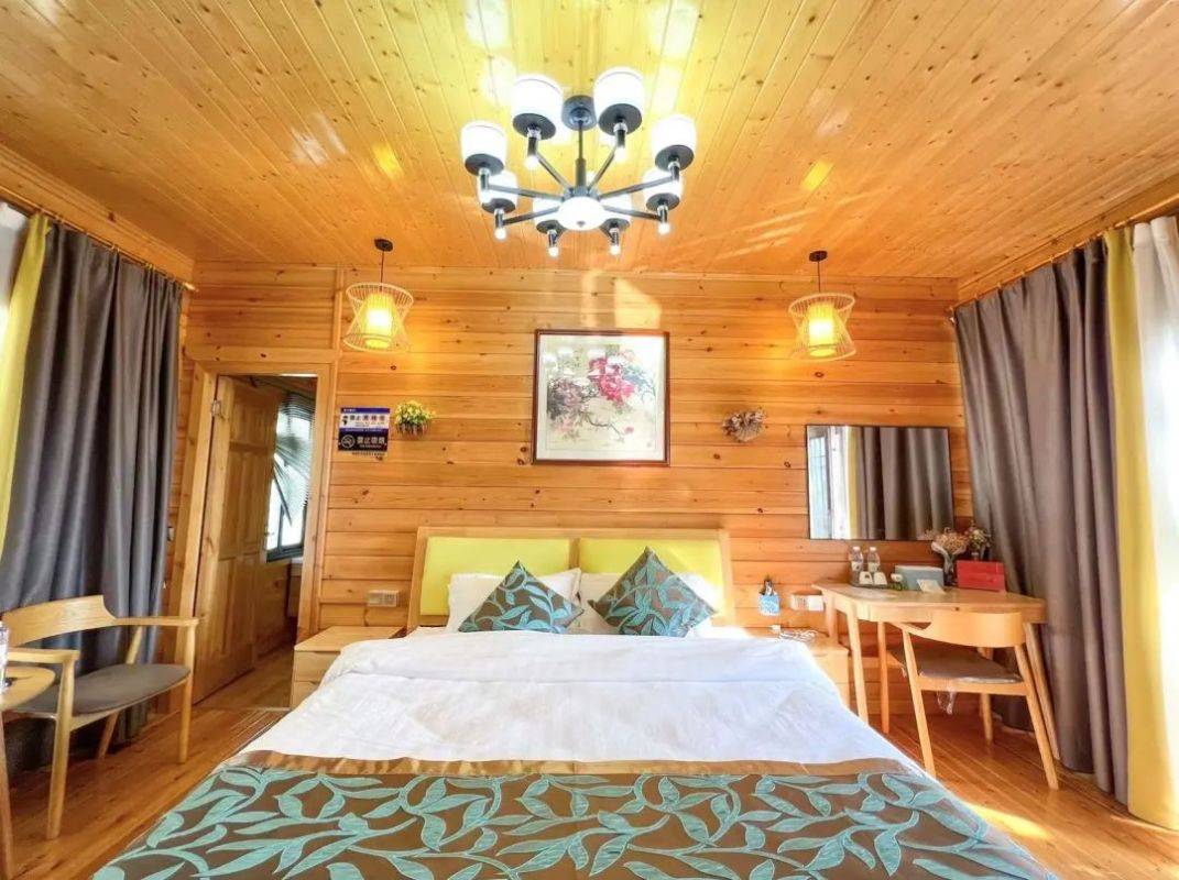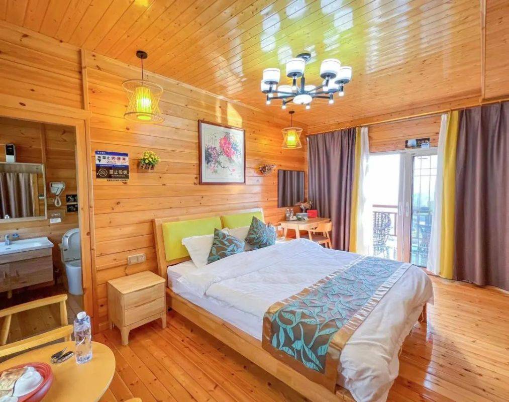 整体房间的木质风格足可见其内敛低奢的雅致之风。比灵缘观景木屋更大的面积,更具有风情的装修、更高处的建筑。搭配上房间内黄白两色的灯光,无疑能够构造出更加舒适的住宿环境,更加美好的住宿体验。