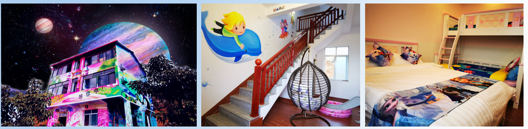 为孩子们量身定制的亲子主题房,外墙主打小朋友们热捧的《叶罗丽.精灵梦》动漫片。