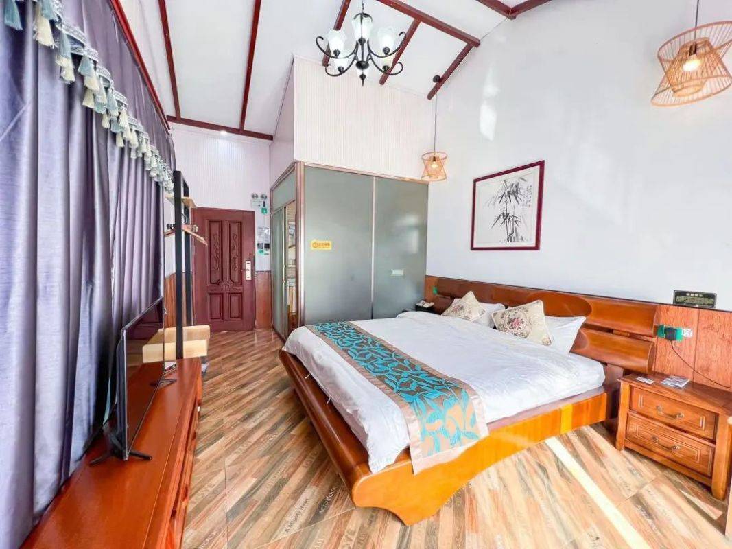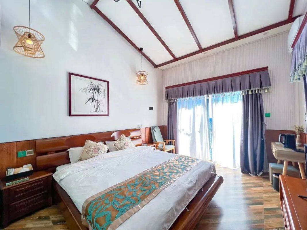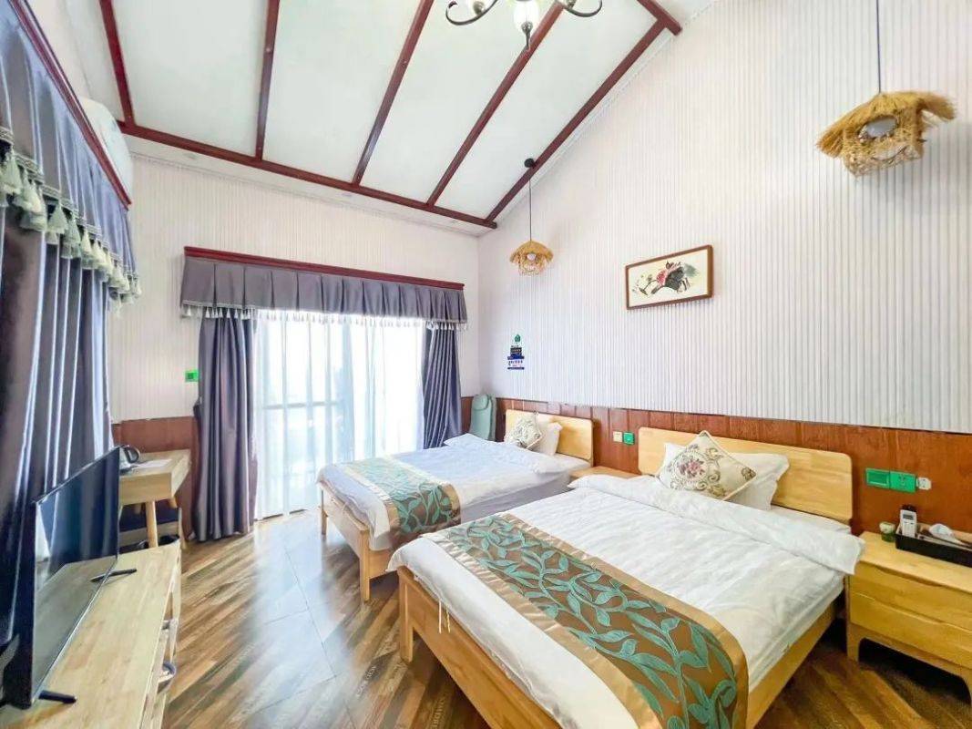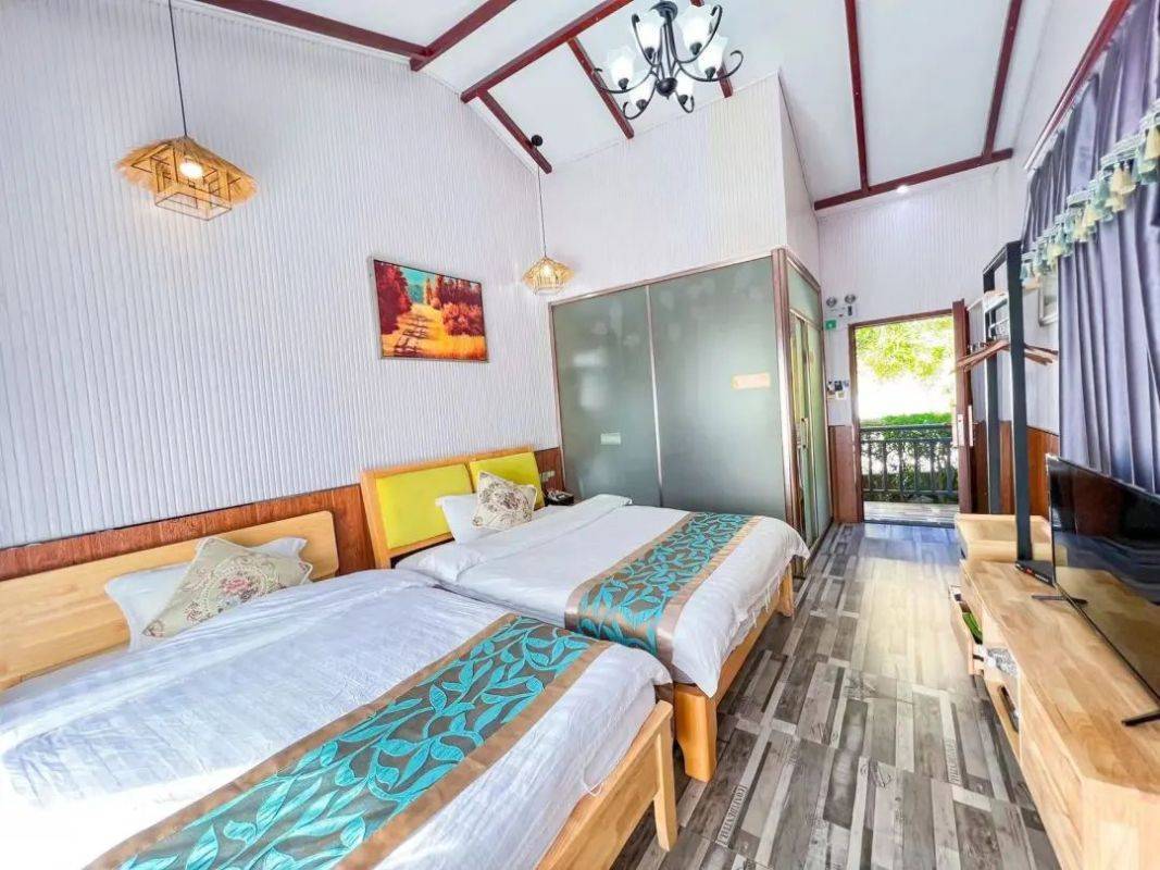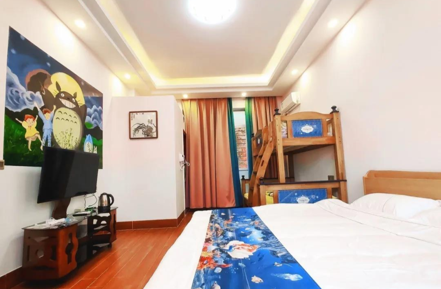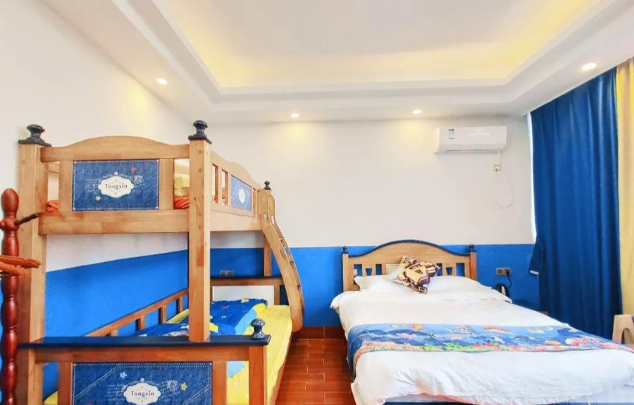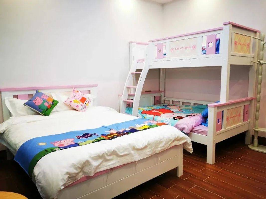 每间客房都配备1张子母床和1张1.5米的大床、适合一家4口出游居住。