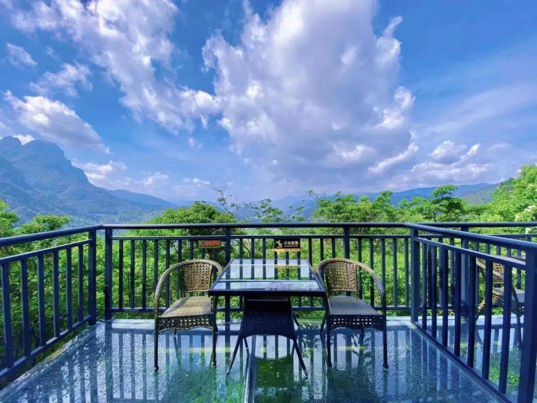 每间木屋都配有一个悬空的玻璃观景台,对面的山峰好似在空中悬浮,云雾飘过,如梦如幻~可与家人饮茶畅谈,或是静坐憩息片刻看流云蹁跹。