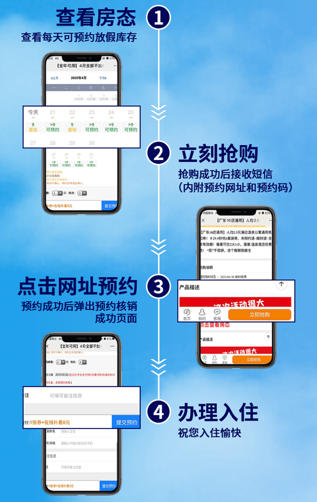 ◆流程说明:抢购—接收预约码—上网预约—预约成功—入住