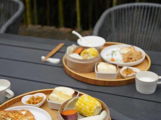 餐厅低调不张扬,有实木、竹等乡野特色材质,可容纳十多人,早餐也及其讲究