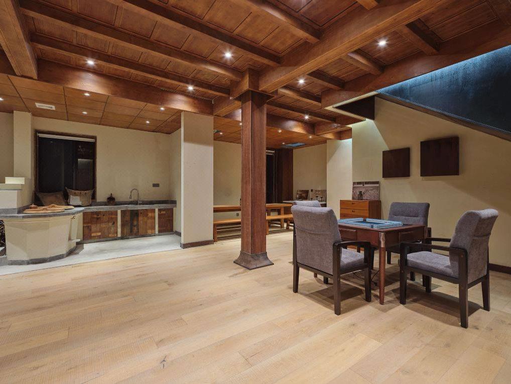 10号楼一层未设客房,全部做成了公区,设休息区,落地窗外景色盎然;吧台区、用餐区,可提供十多人聚会、会议;下沉式会客厅,可观影、读书会谈。