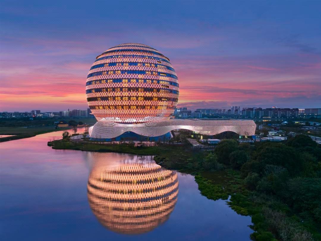 酒店地处湖州南浔明珠路18号,毗邻生态湿地沈庄漾湖畔,临水而建,水光潋滟。每当夜幕降临,“太阳”便焕发光彩,熠熠生辉,美轮美奂。