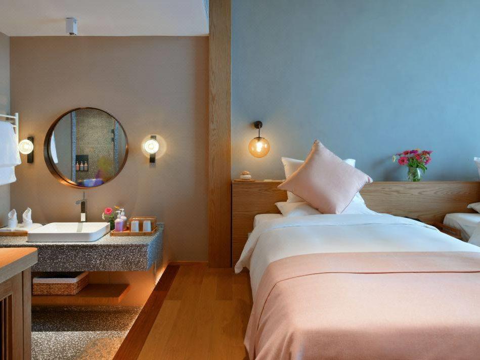 酒店共有63间客房或套房散落分布,形成一层公区与二层别墅的度假结合,二楼配有共享的室内客厅和室外大露台,三五好友还可以在一起小坐聊天。