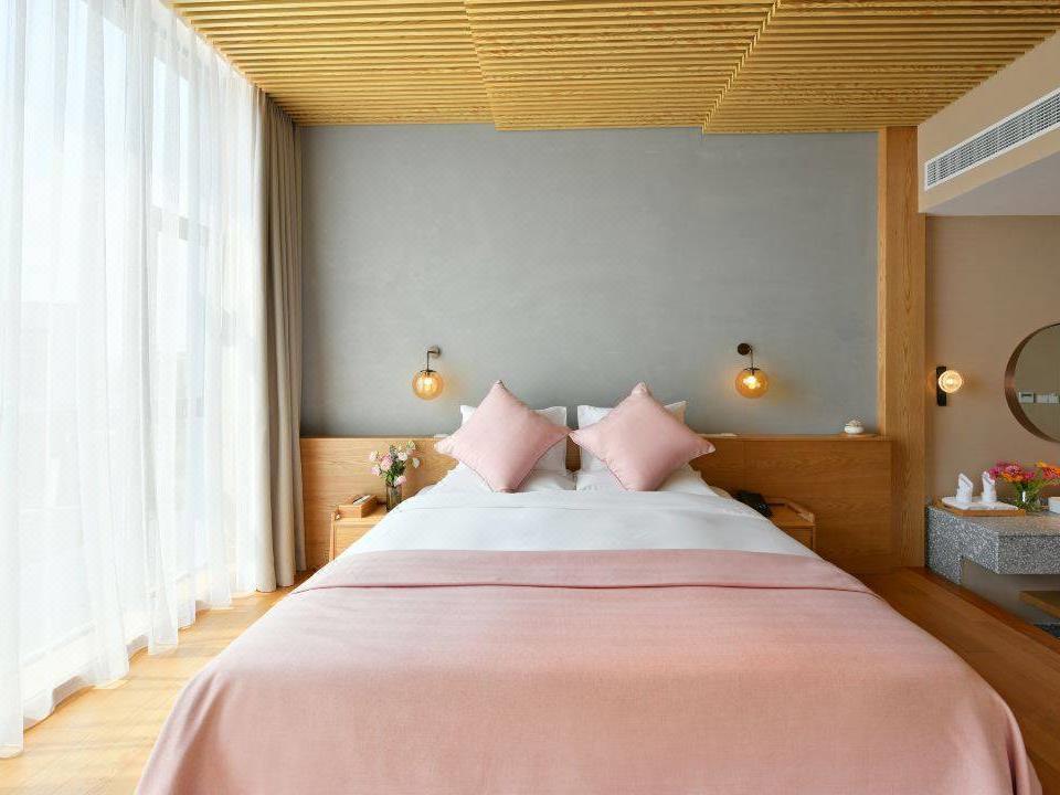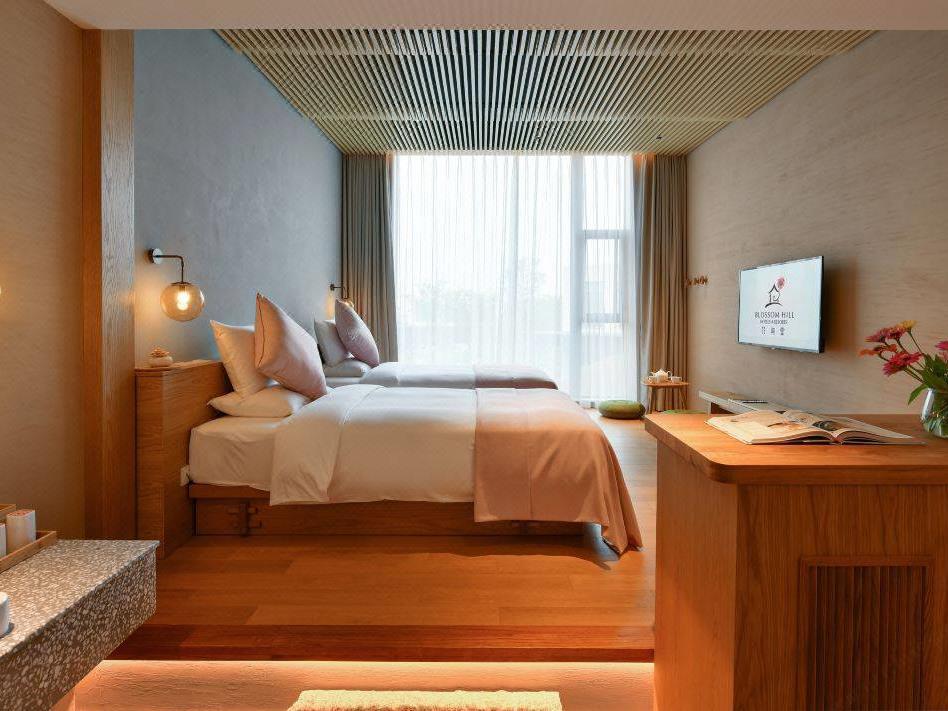 客房分为基础房、亲子房、复式房、私汤房等,内部均为日式简约风格,初见暖色调给人舒适的感觉,木质地板桌椅搭配浪漫樱花粉床裙、抱枕,鲜花点缀更显浪漫。本次套餐入住的是花之雅居大/双床房,面积33㎡起跳,落地窗使室外景观尽收眼底。