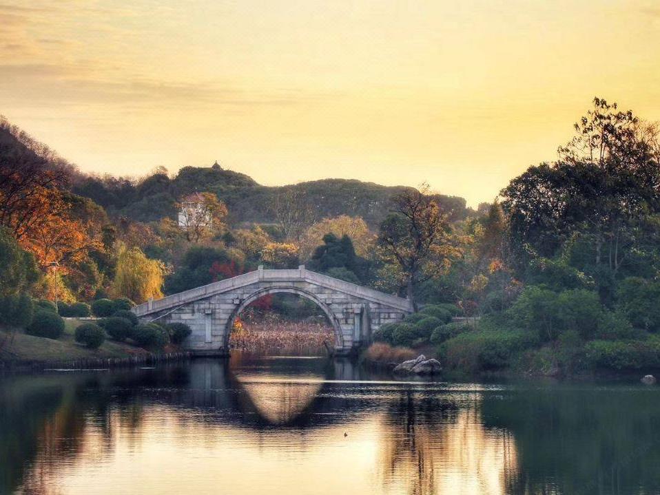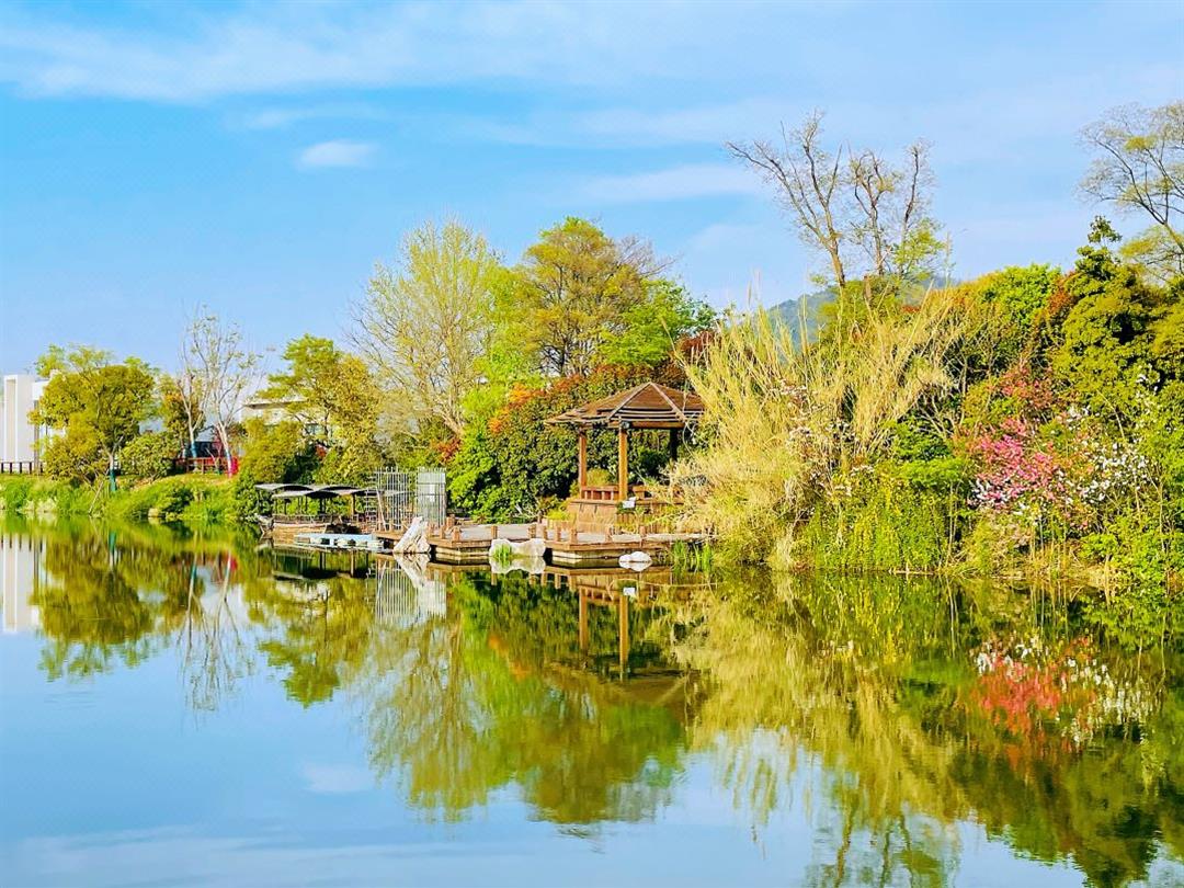 桃花岛景观公园以桃为主题,揉合了英式和江南园林风格。公园由两个大岛屿和三个小岛组成,总占地面积约23万平方米,园内亲水平台、休闲景观亭、景观喷泉、景观植物相互映衬。