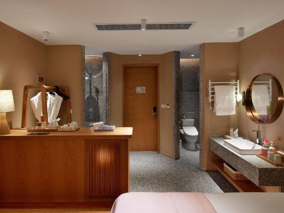 温泉馆面向阳山,分日式男女汤,每个泡池配日式山水院景;可以一边体验汤浴的温暖,一边欣赏落地窗外若隐若现的日式园林艺术。(酒店按实际情况提供)