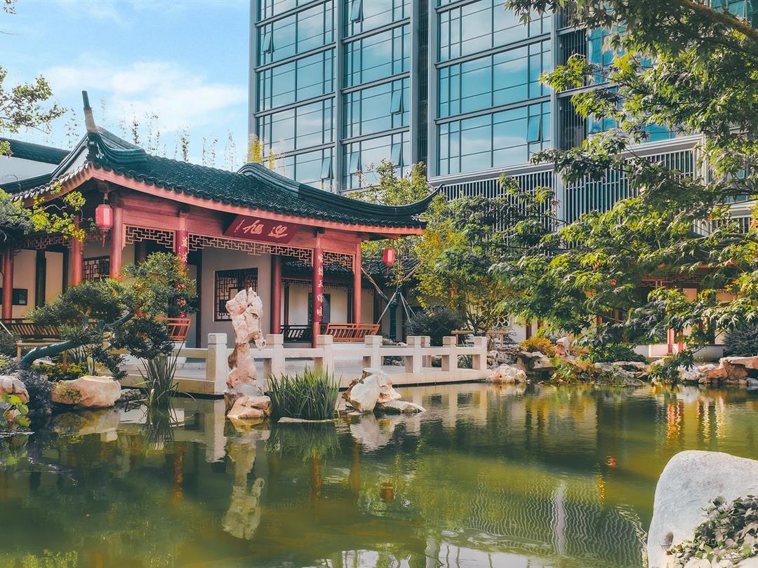 当古韵和现代相互交融,林立的现代建筑环绕园林观景呈现入画,穿越之感油然而生。