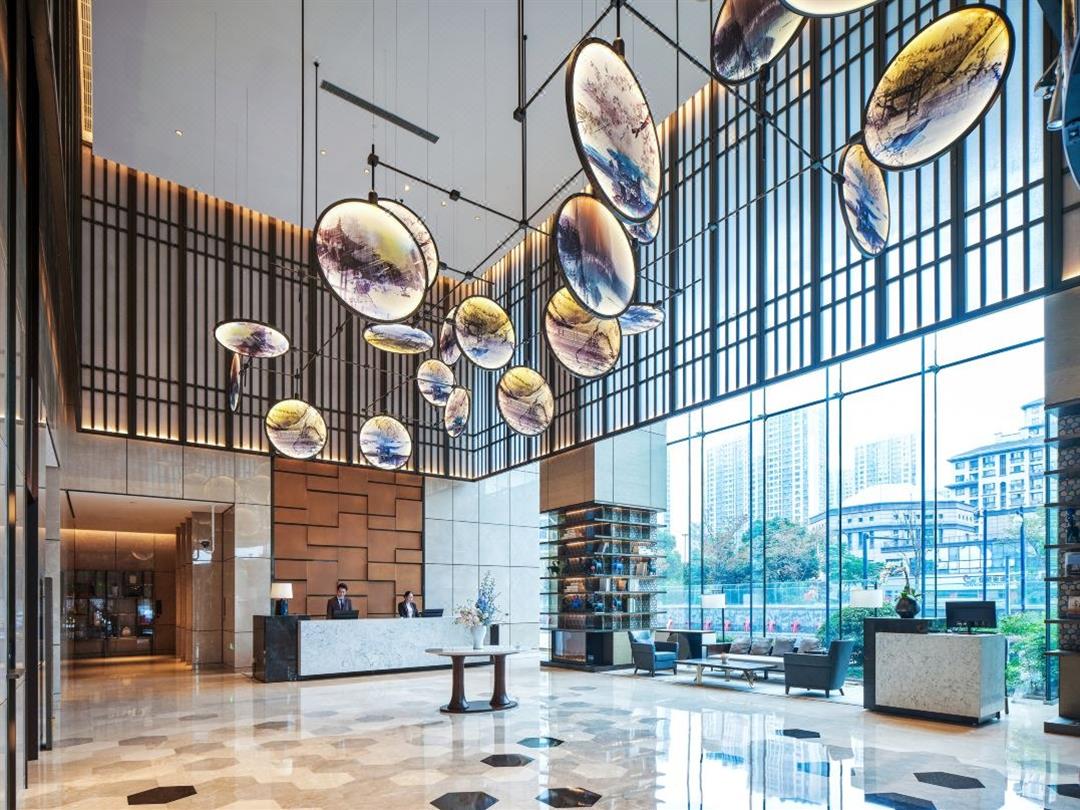 酒店本身也是一座艺术馆,室内设计由大咖团队HBA操刀,每个角落都回荡着杭城的不凡风韵。深谙中式美学的HBA,以艺术品「杭州之梦」扇面灯,取代传统水晶灯,扇面展示着“西湖十景”。轻盈吹落,仿佛有文人轻拂扇子,吟唱诗词歌赋。