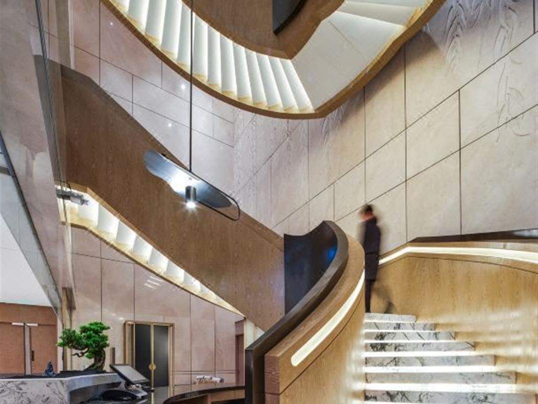 由赫希贝德纳联合设计事务所设计旋转楼梯,楼梯边的墙壁上刻有垂柳,有漫步西湖之雅。