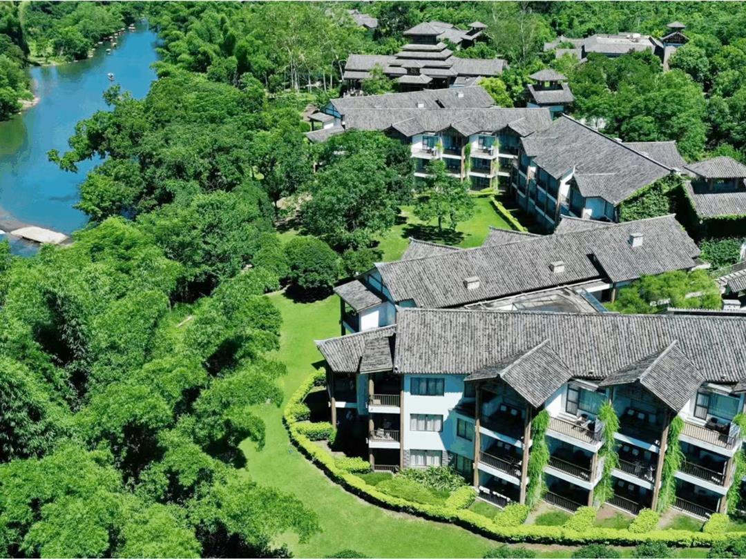 酒店占地300亩,由国内外专业团队精心打造,建筑以桂北侗族民居风格为蓝本,融入中式园林元素,通过通透连廊串联九栋楼,形成如入画中的诗意环境。